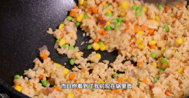 制作炒饭:洋葱放入油锅内煸香,出香味后放入裹了蛋黄的米饭炒匀,再依次放入胡萝卜粒、玉米粒、青豆,等米饭稍脱水后,放入西红柿粒炒匀即可。