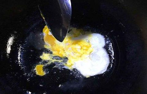 制作蛋卷:打两个鸡蛋,放入剁碎的蛋白粒打匀成蛋液后,不放一滴油,均匀倒入平底煎锅内摊成蛋皮。