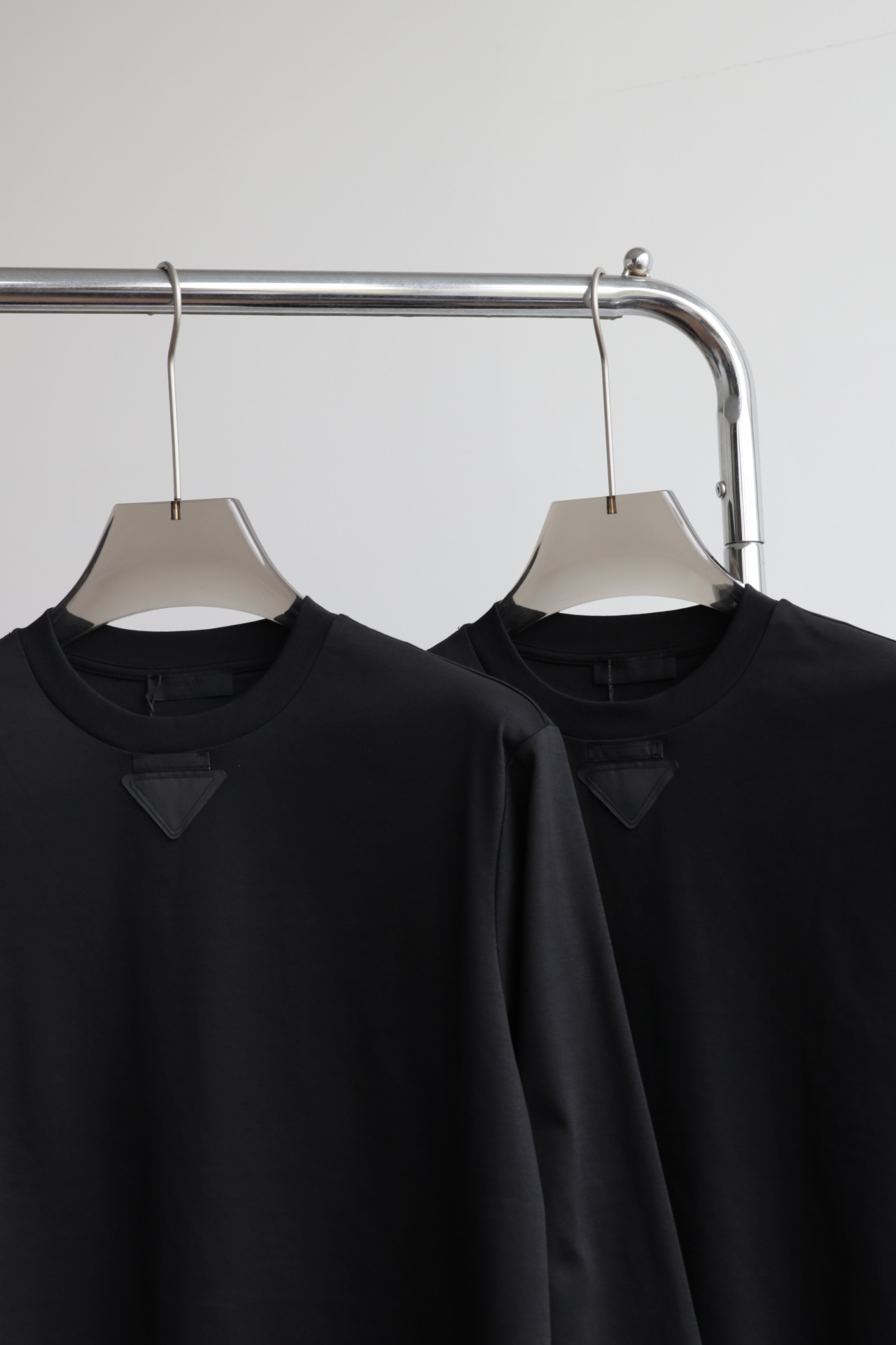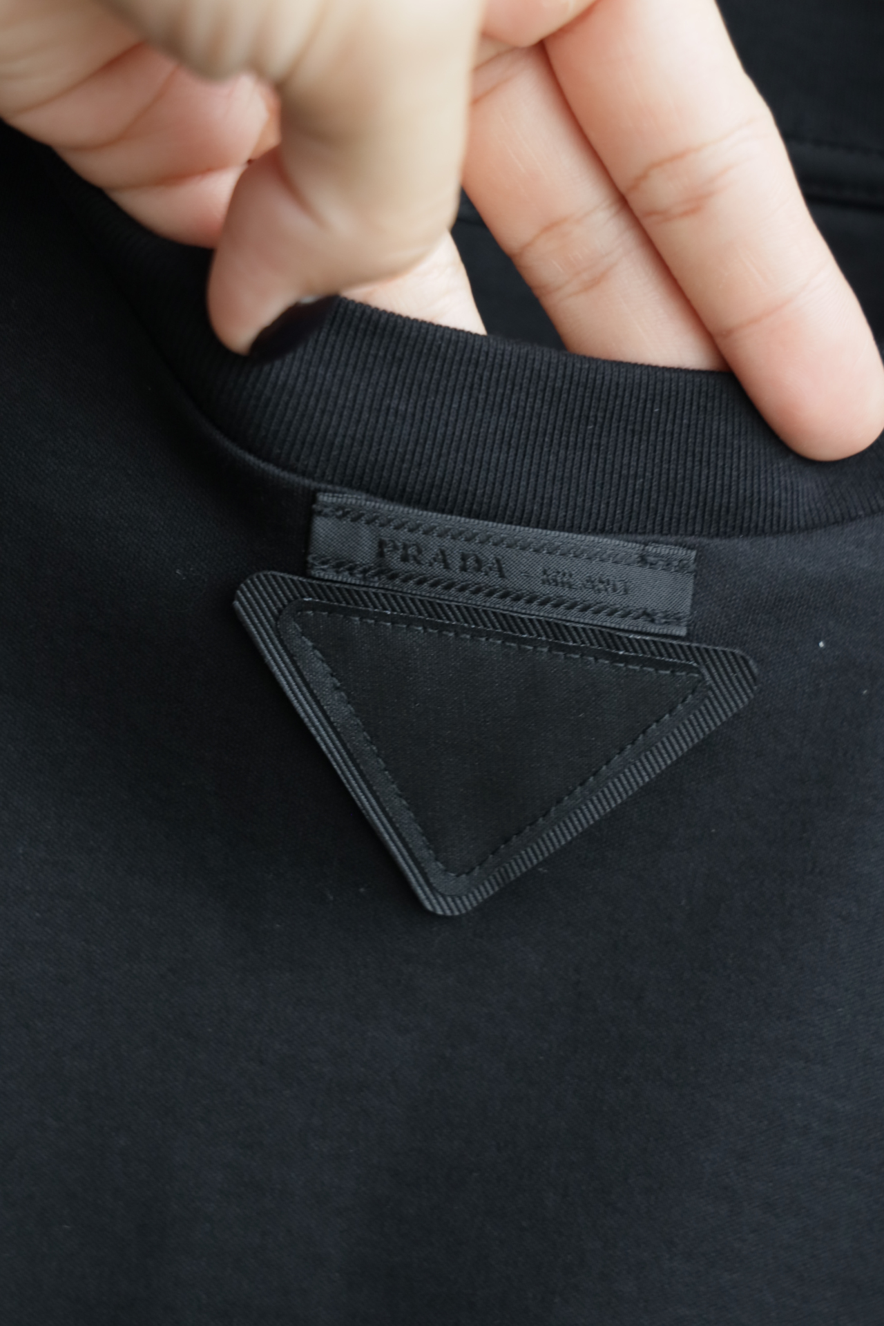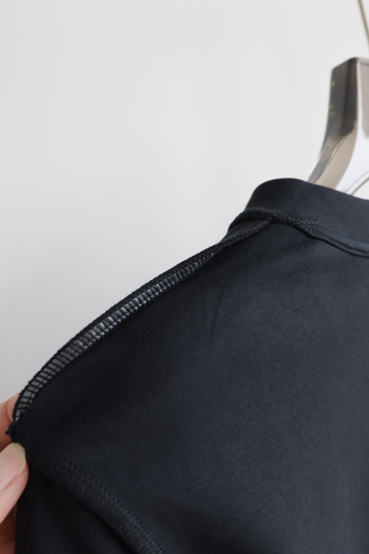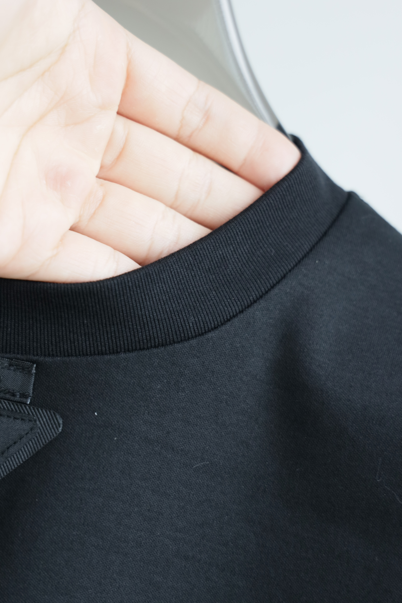 领口贴补三角+字母徽标,双标装饰,都是同色系黑色,风格整体简约低调有高级感