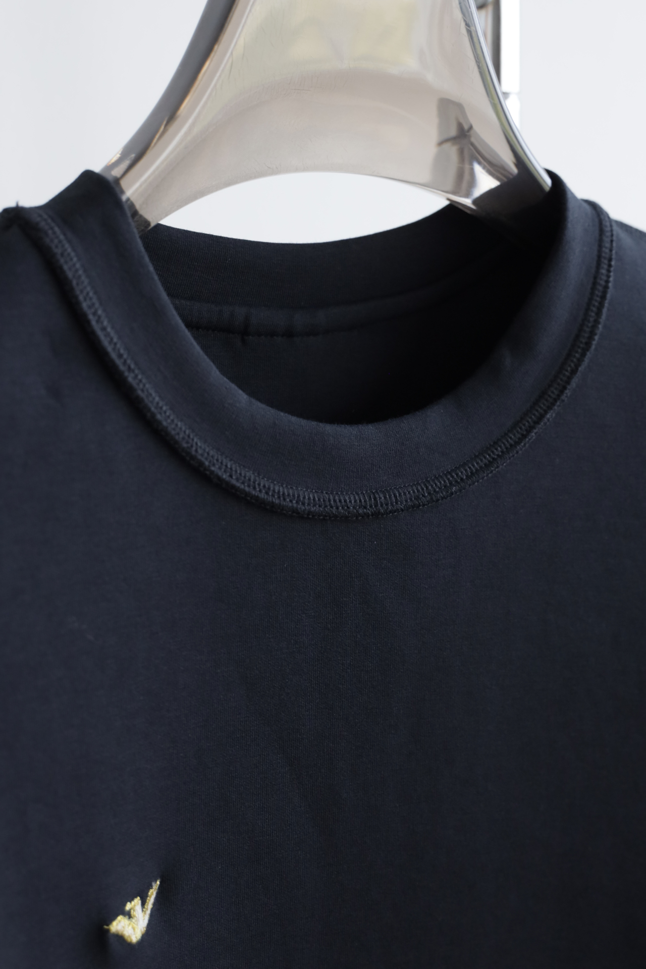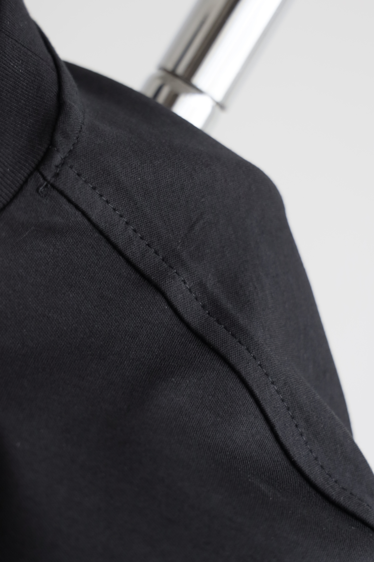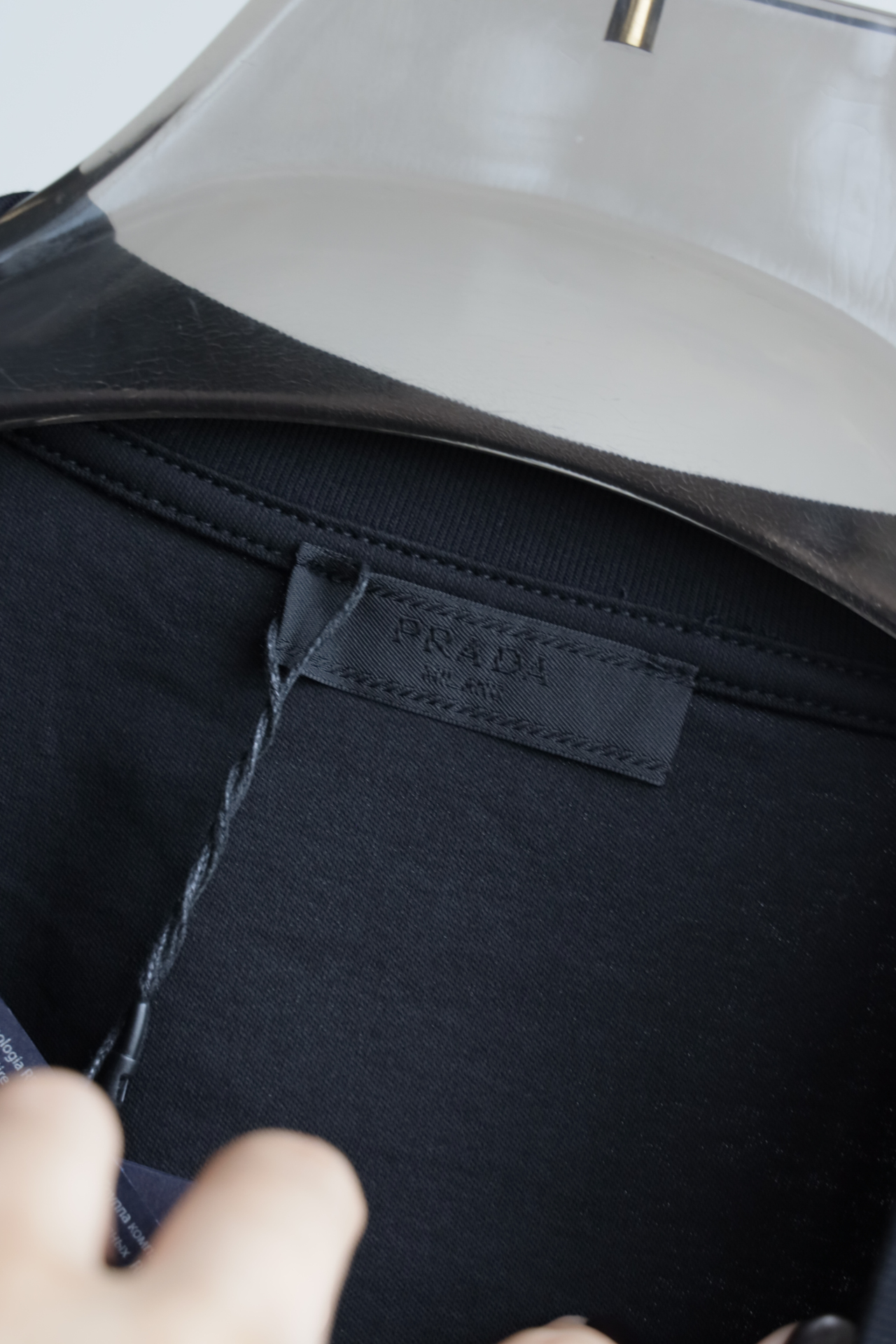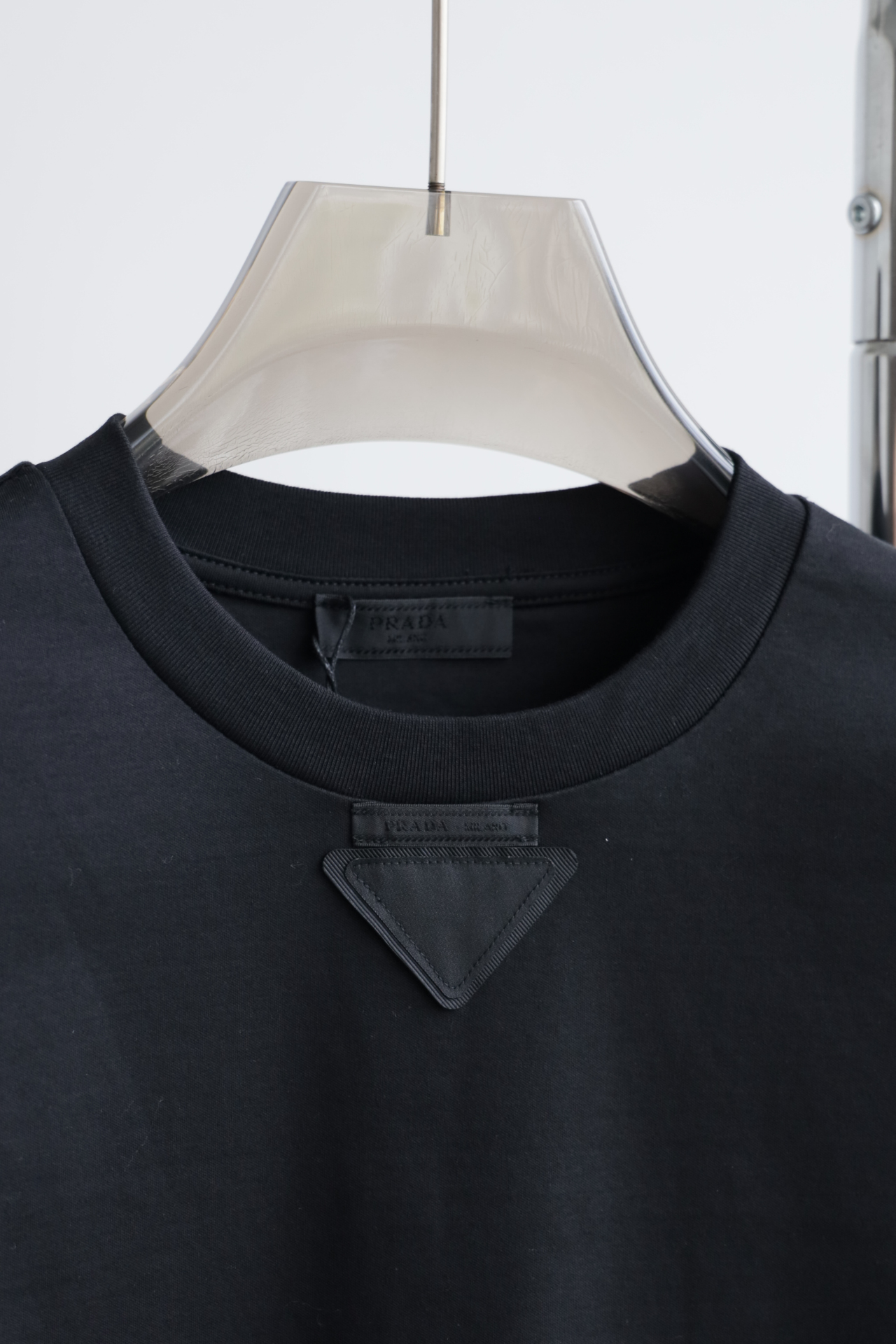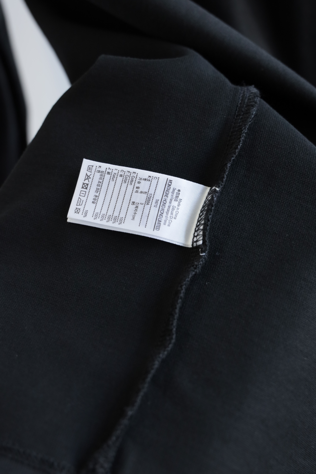领口贴补三角+字母徽标,双标装饰,都是同色系黑色,风格整体简约低调有高级感