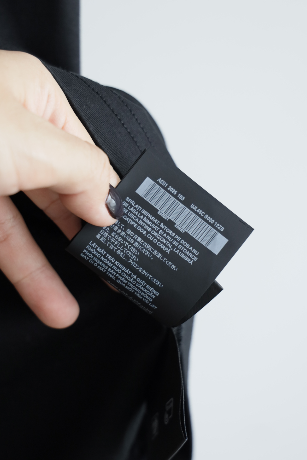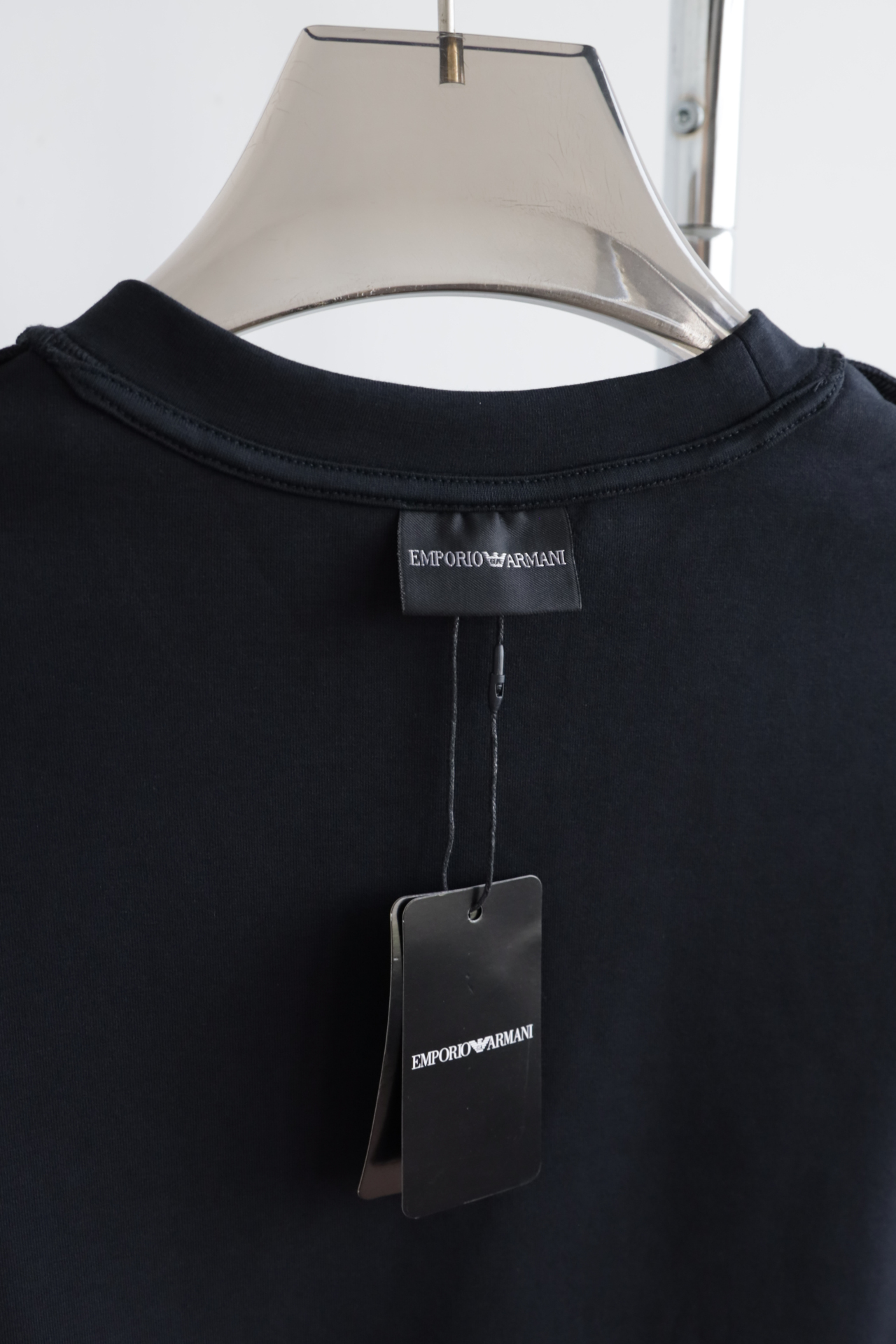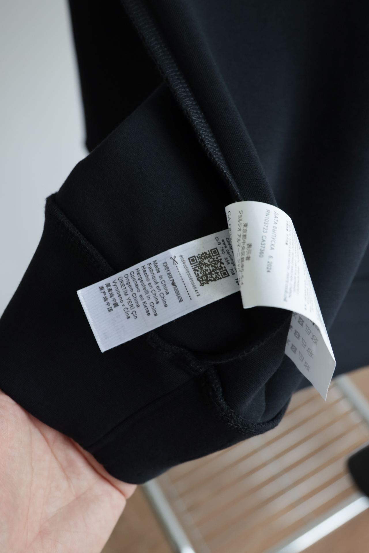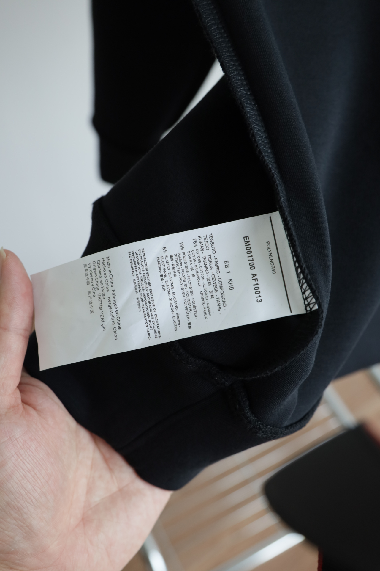 领口贴补三角+字母徽标,双标装饰,都是同色系黑色,风格整体简约低调有高级感