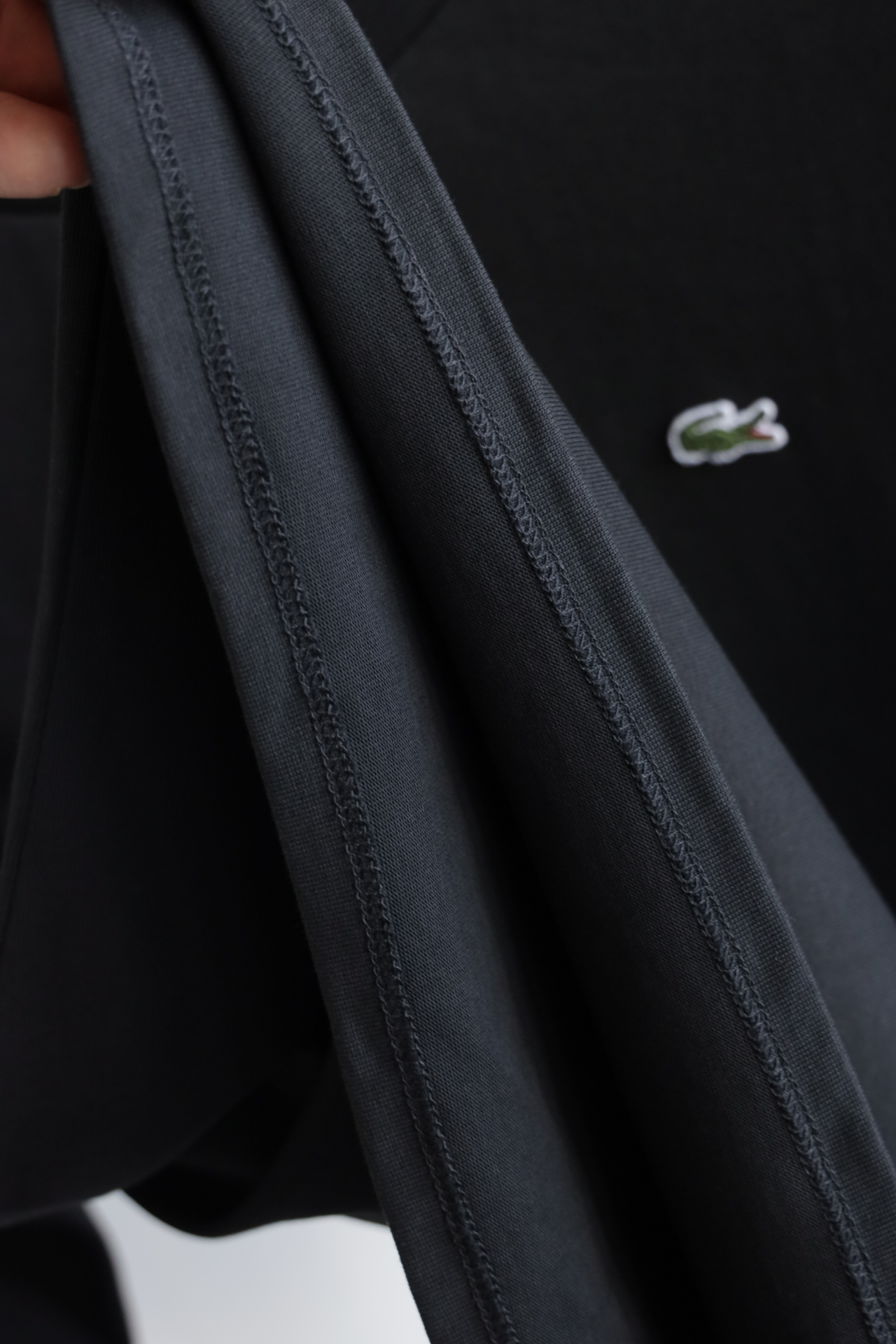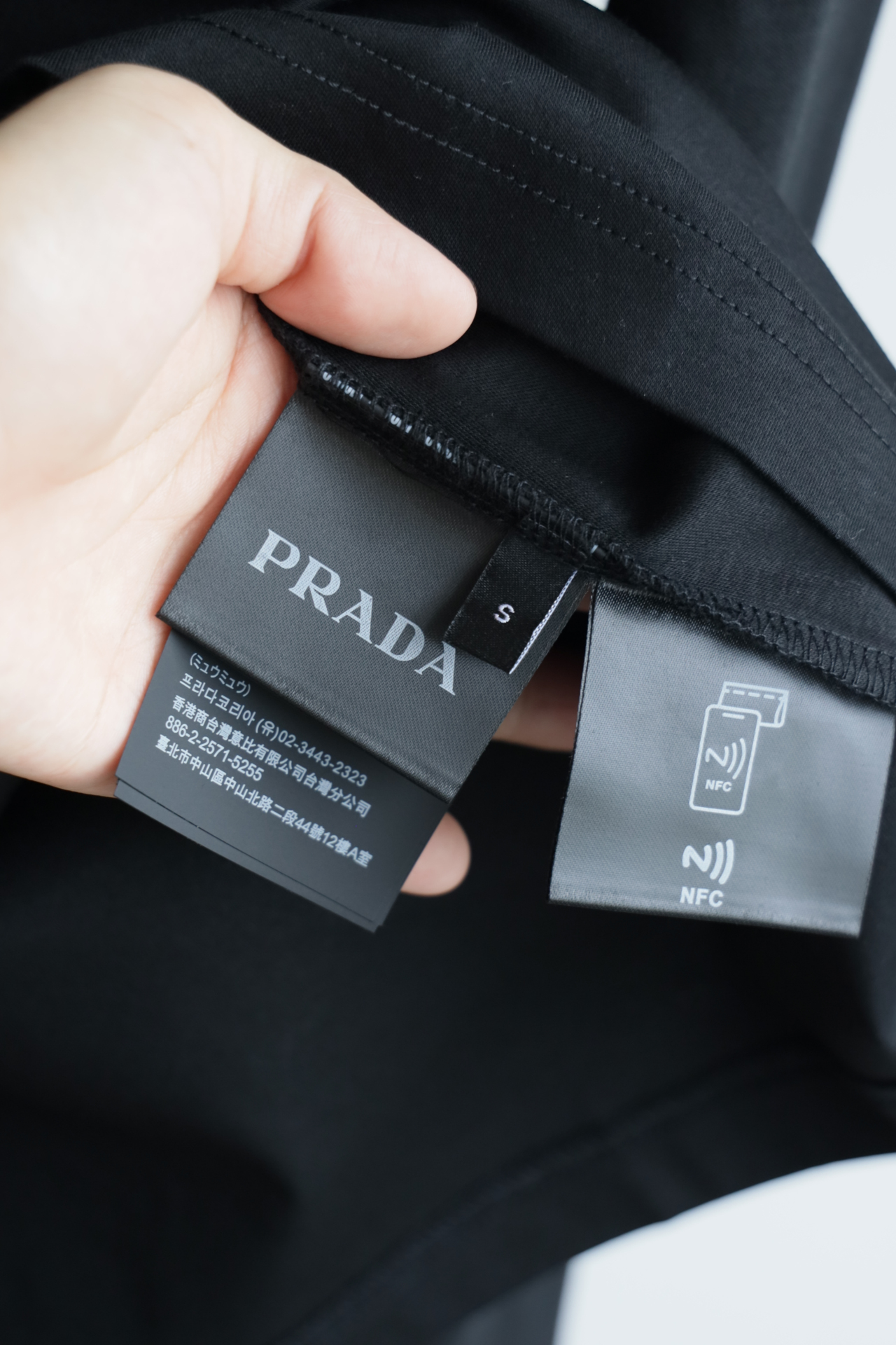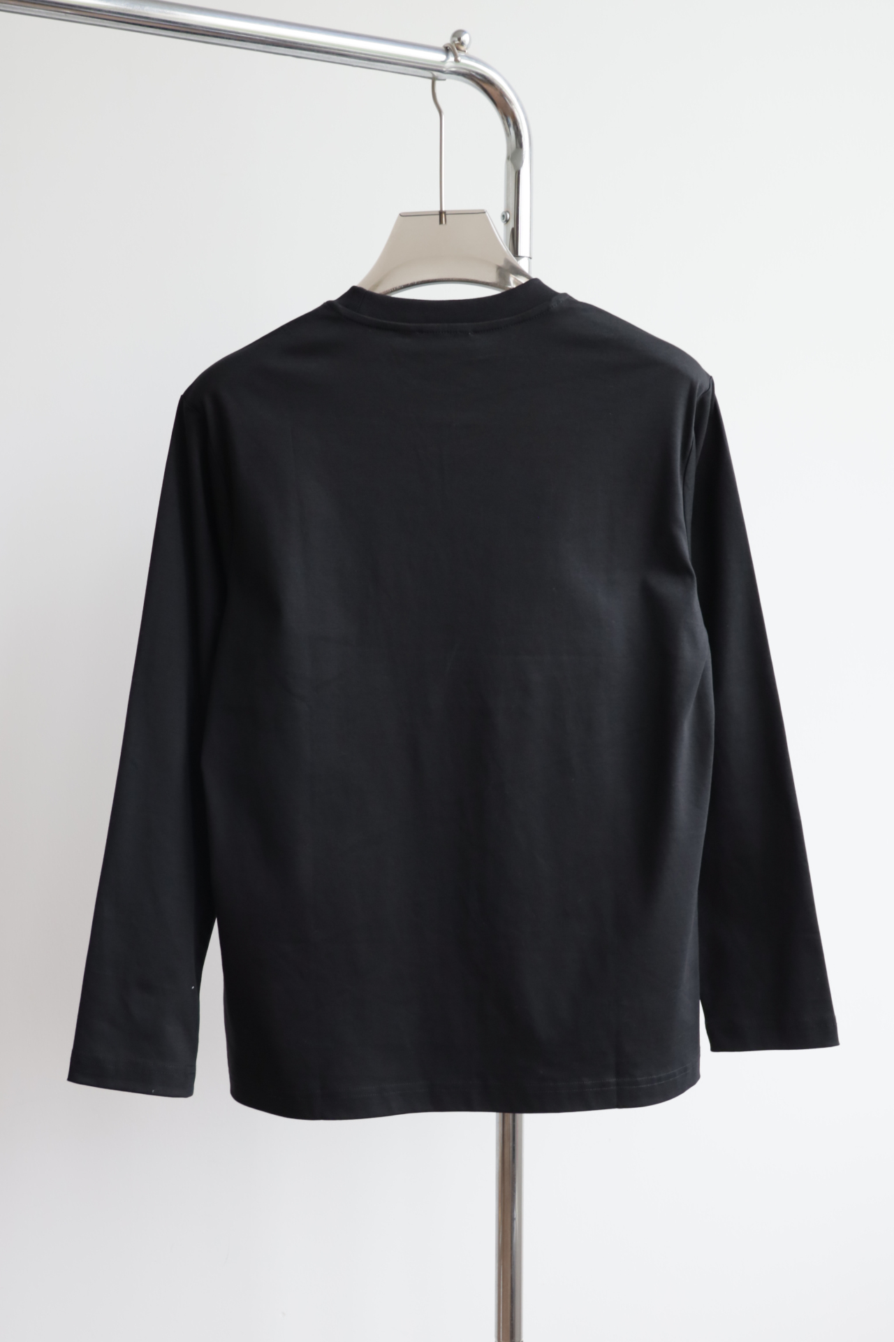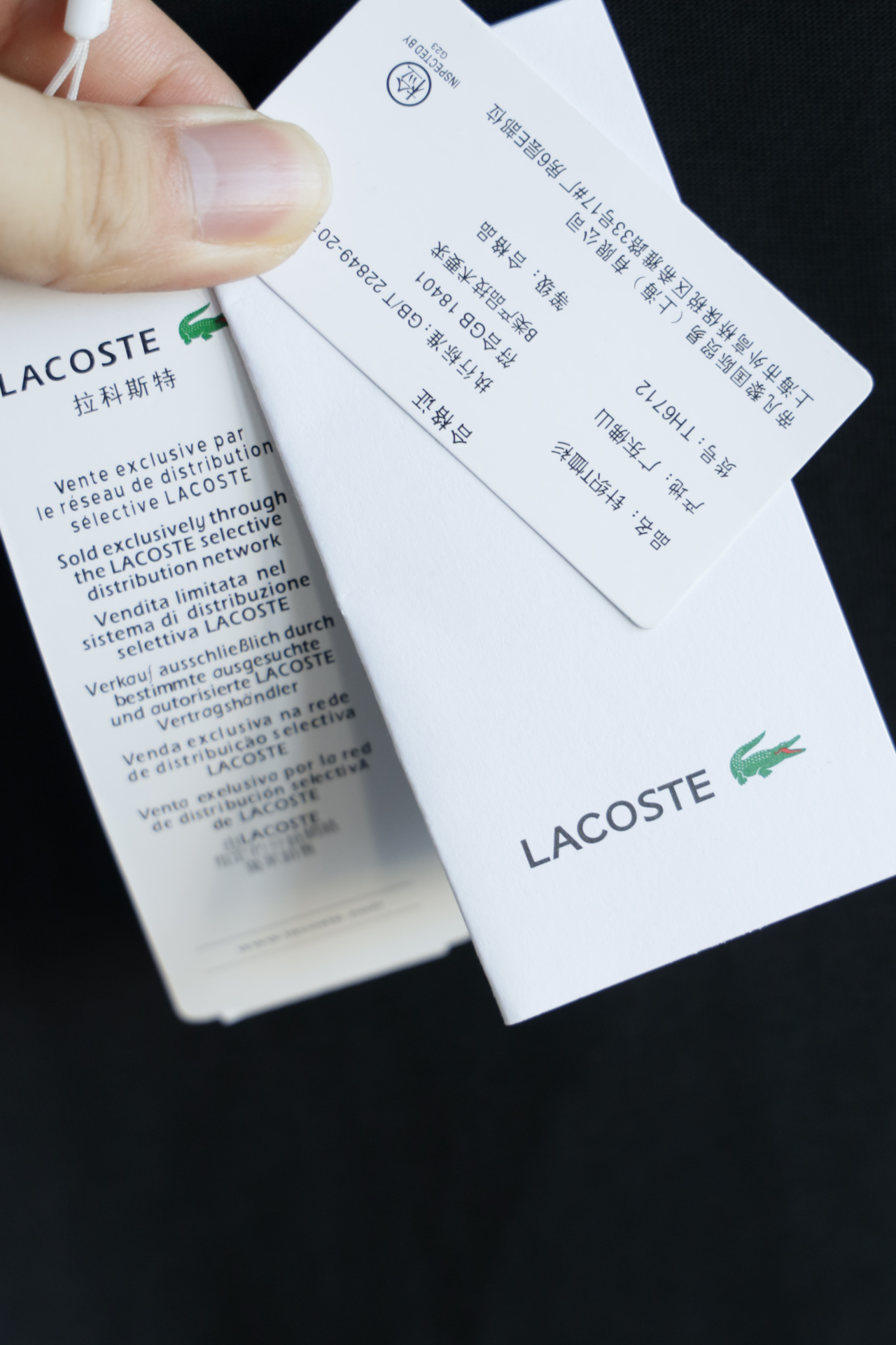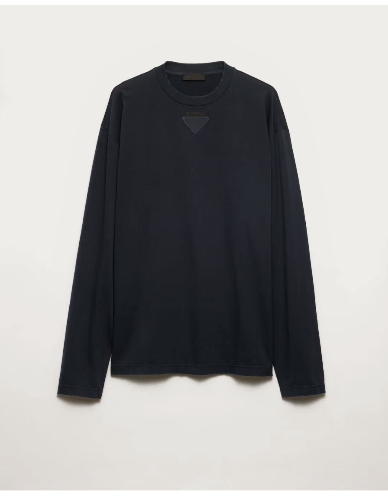 领口贴补三角+字母徽标,双标装饰,都是同色系黑色,风格整体简约低调有高级感