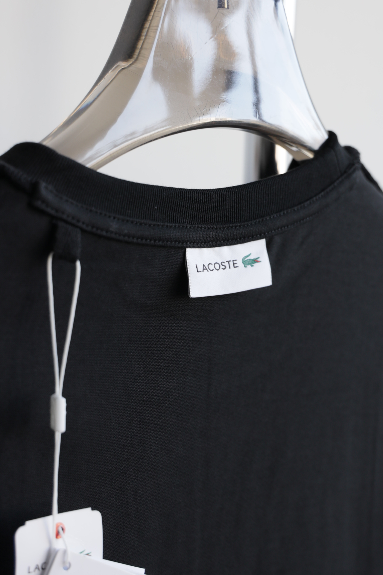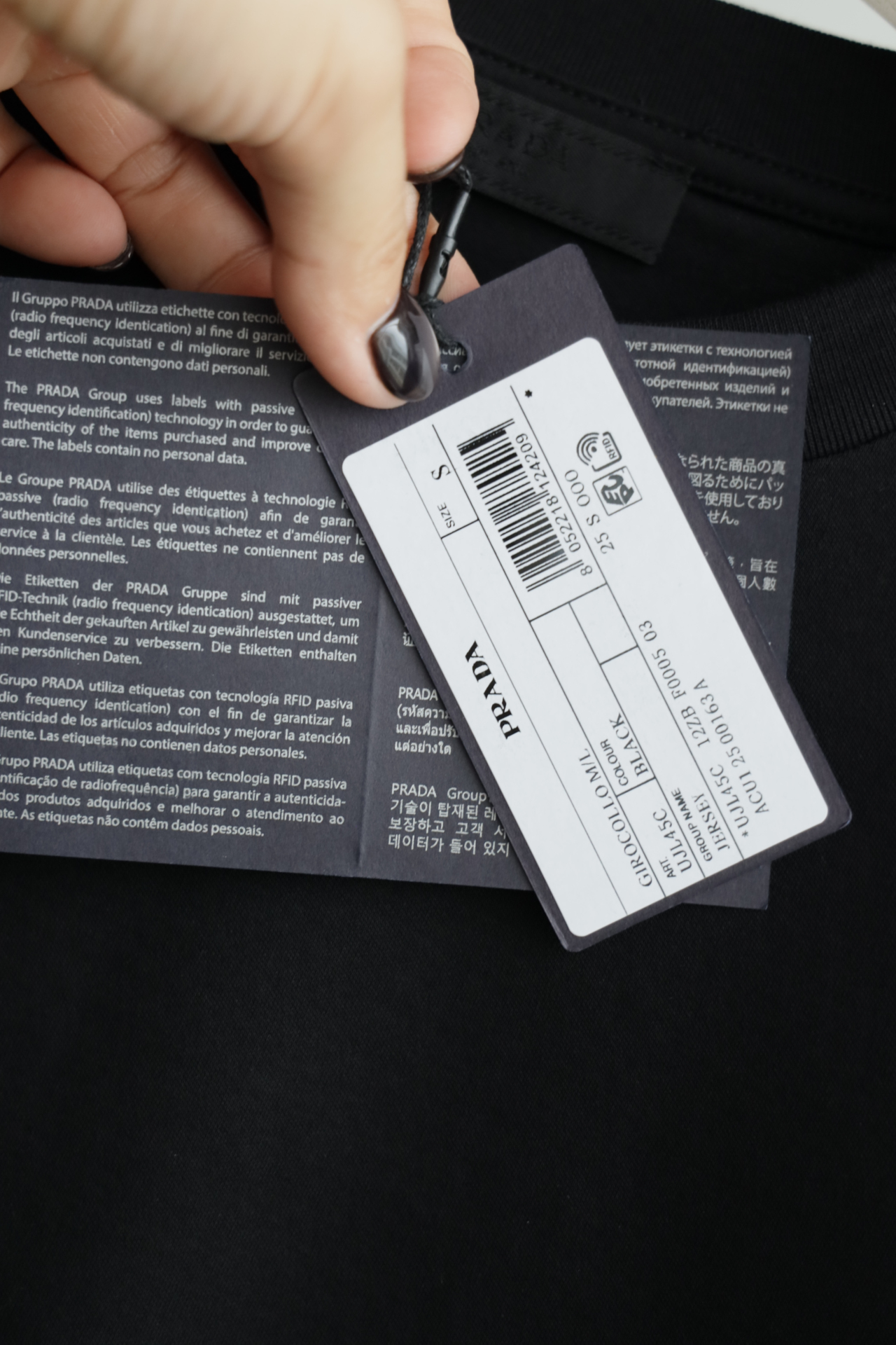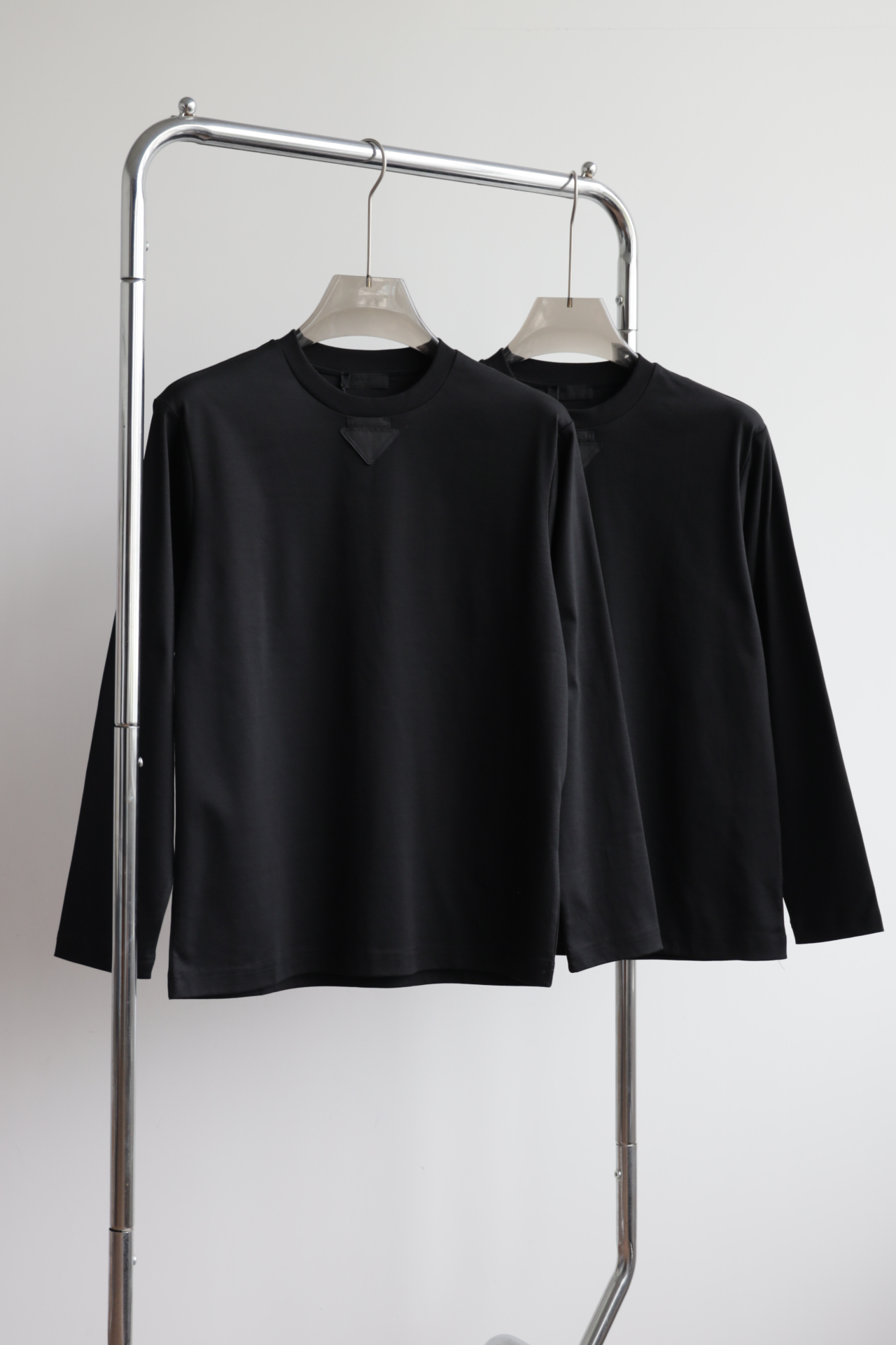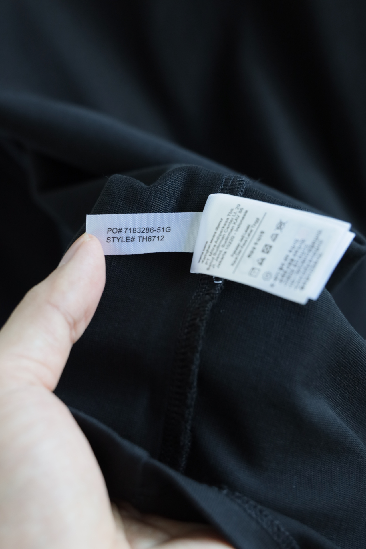 领口贴补三角+字母徽标,双标装饰,都是同色系黑色,风格整体简约低调有高级感