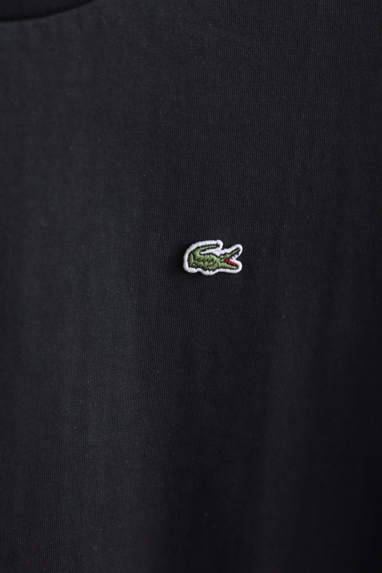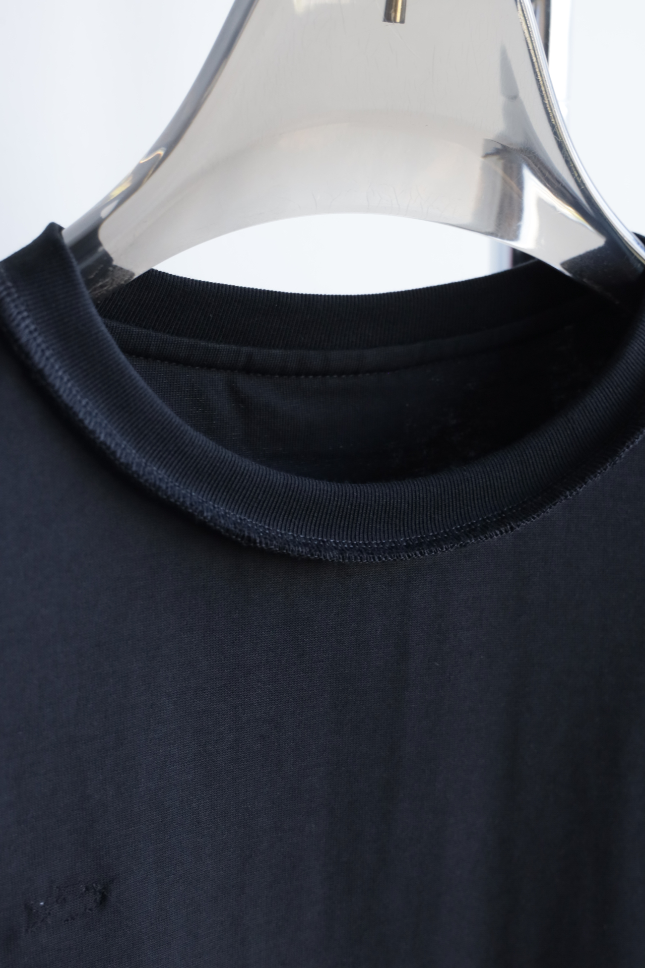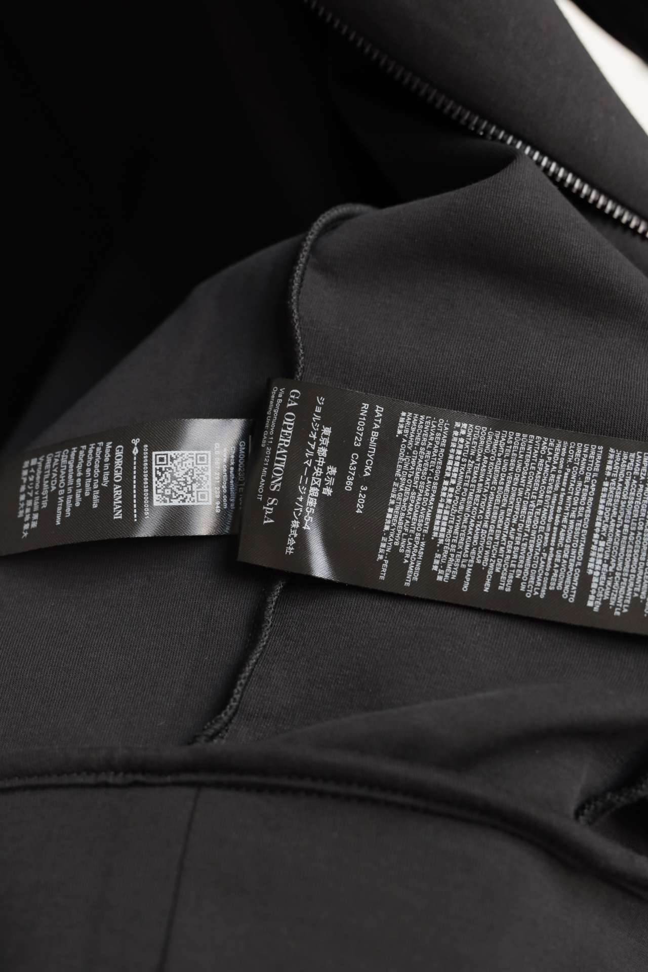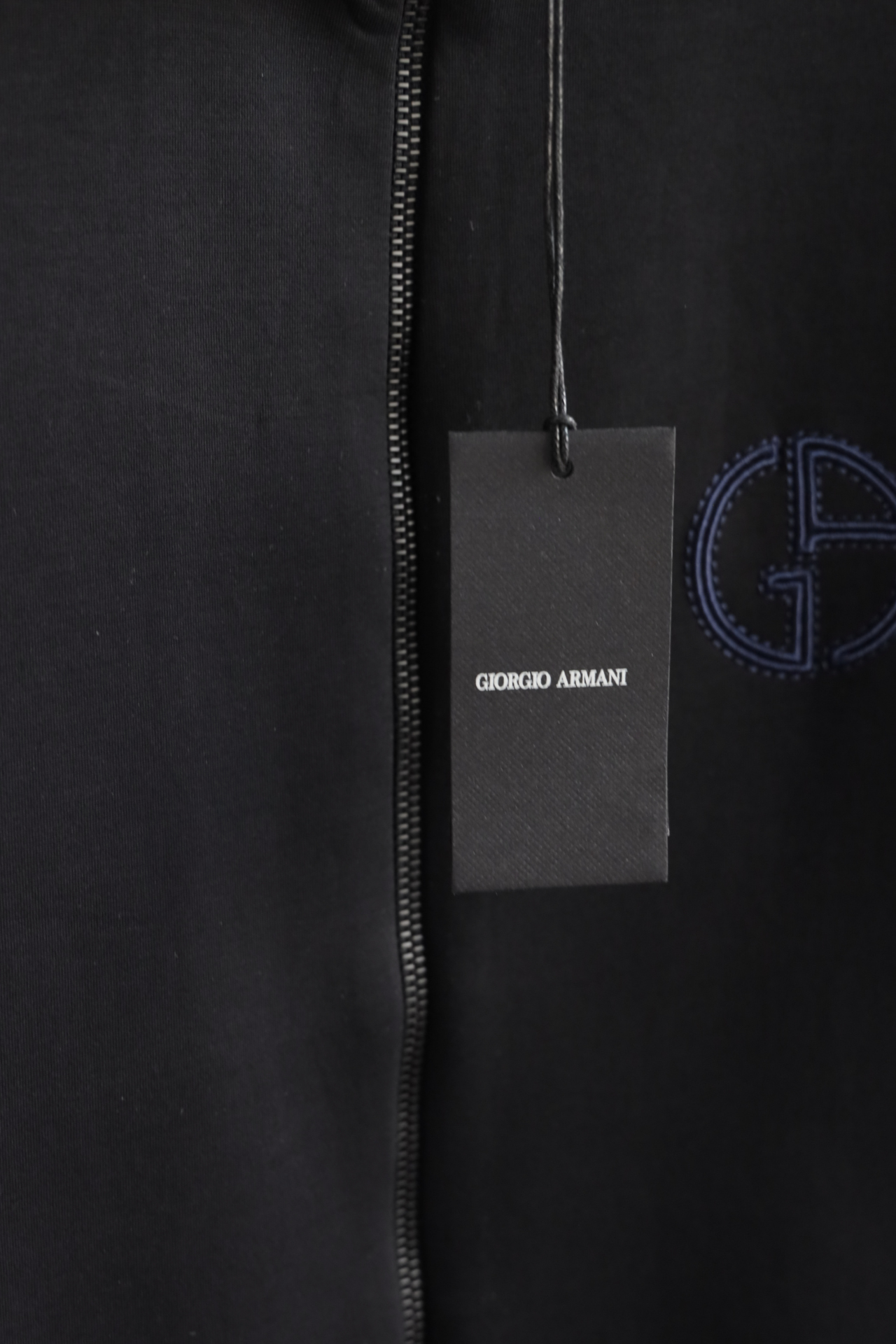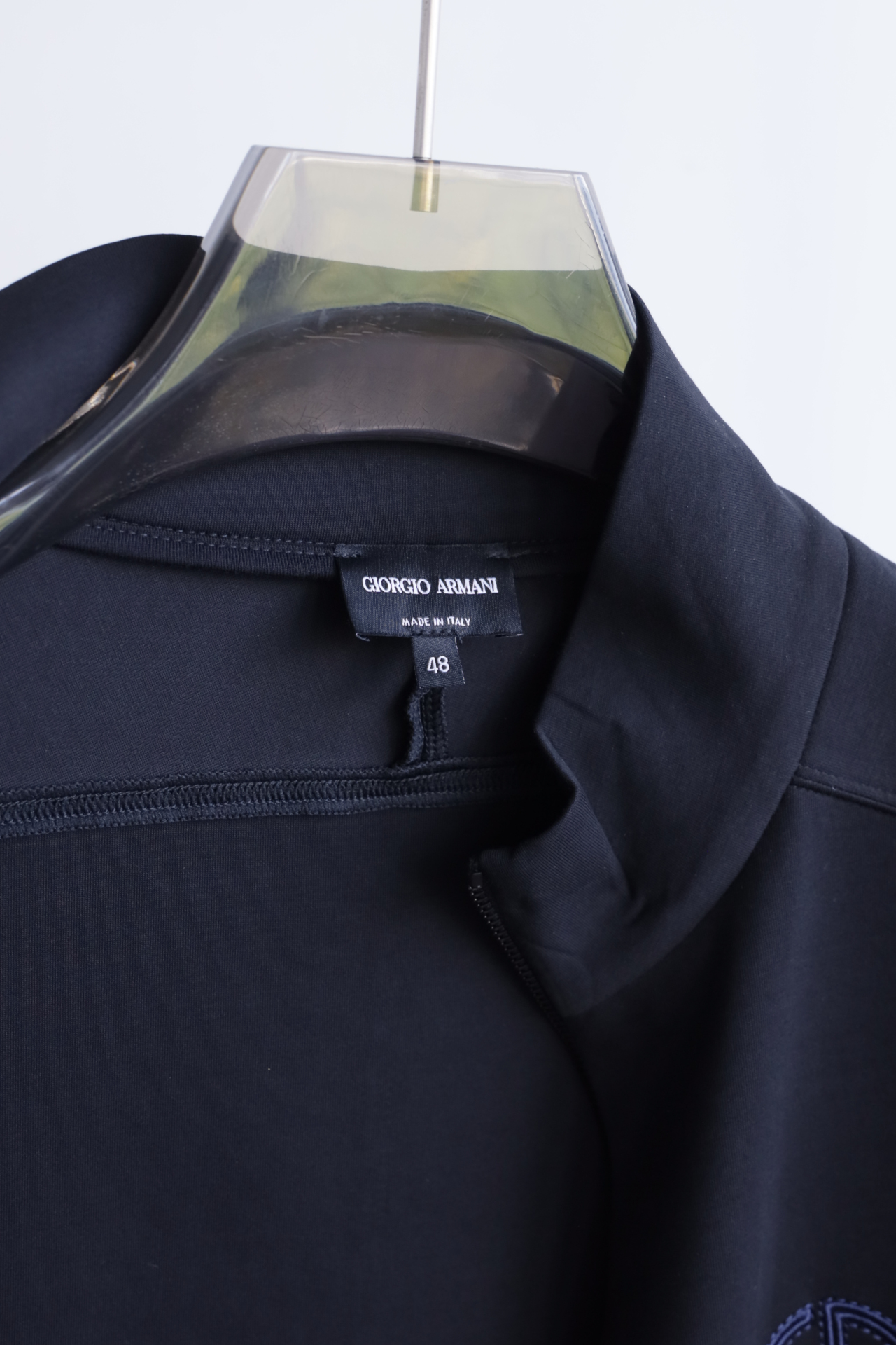 领口贴补三角+字母徽标,双标装饰,都是同色系黑色,风格整体简约低调有高级感