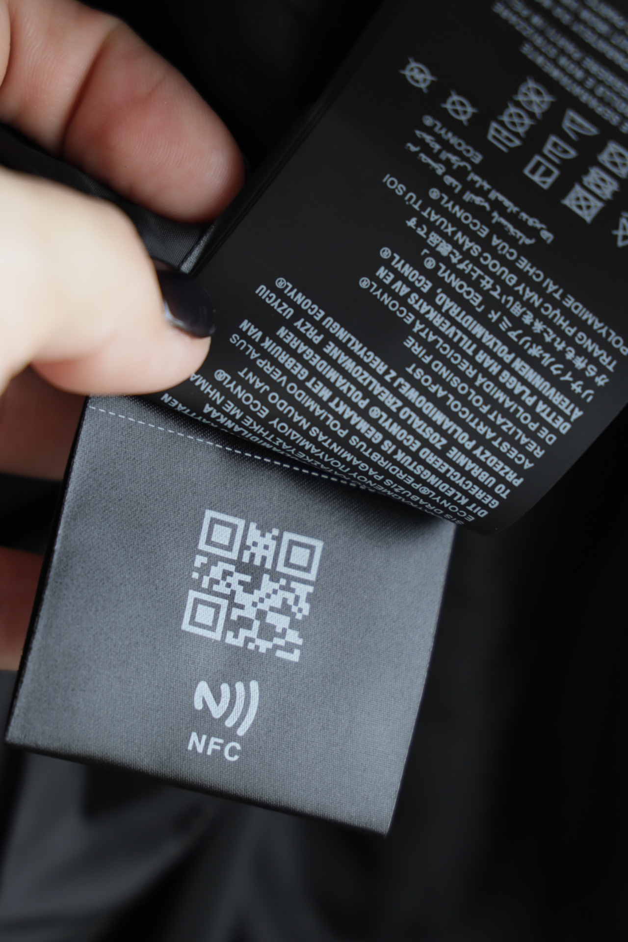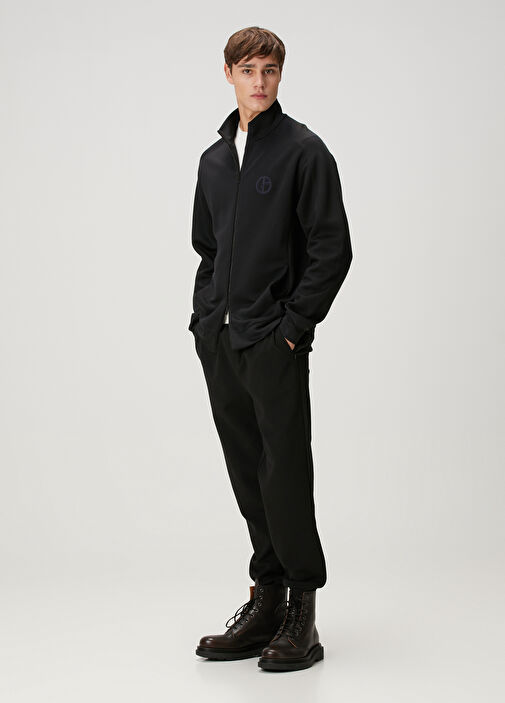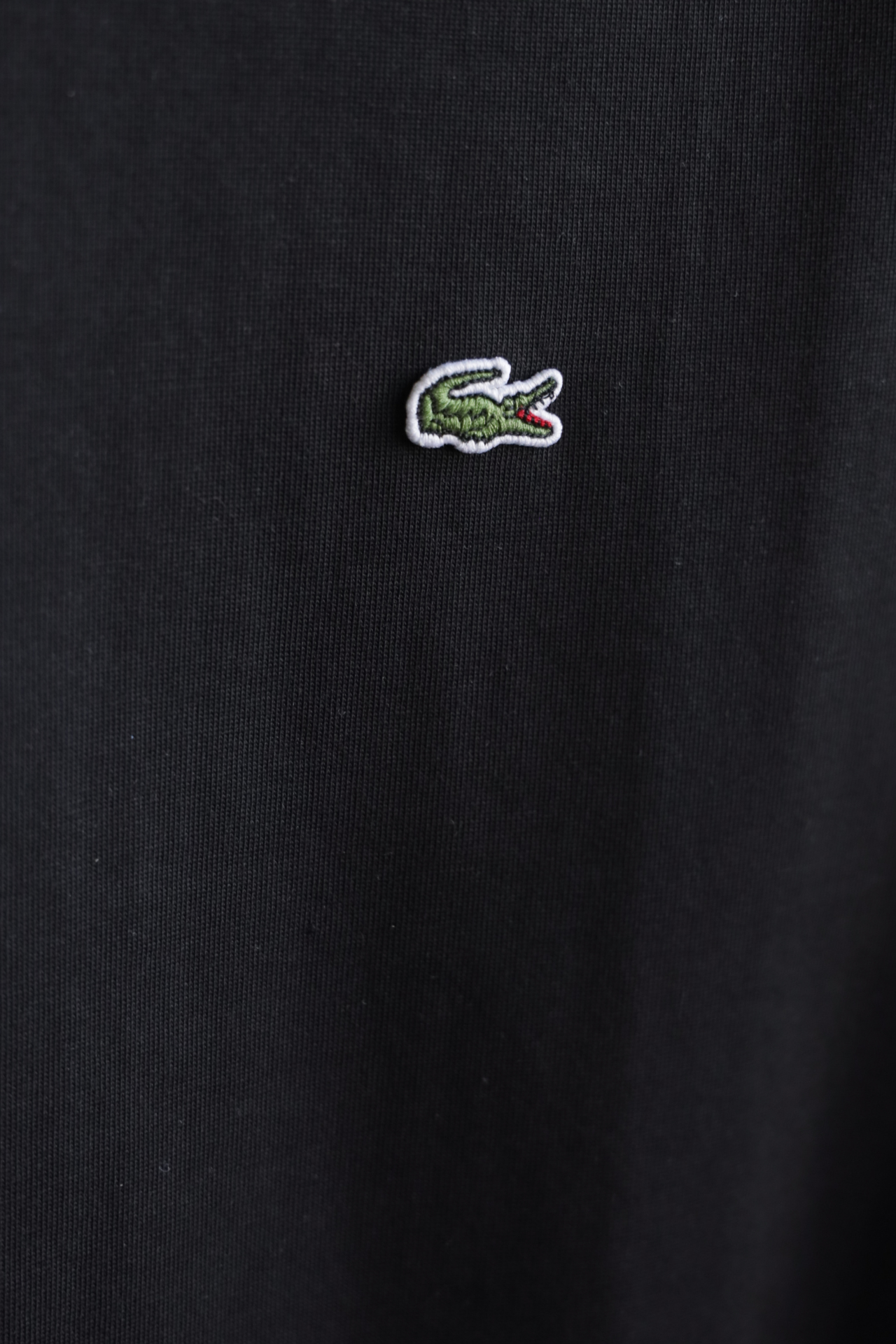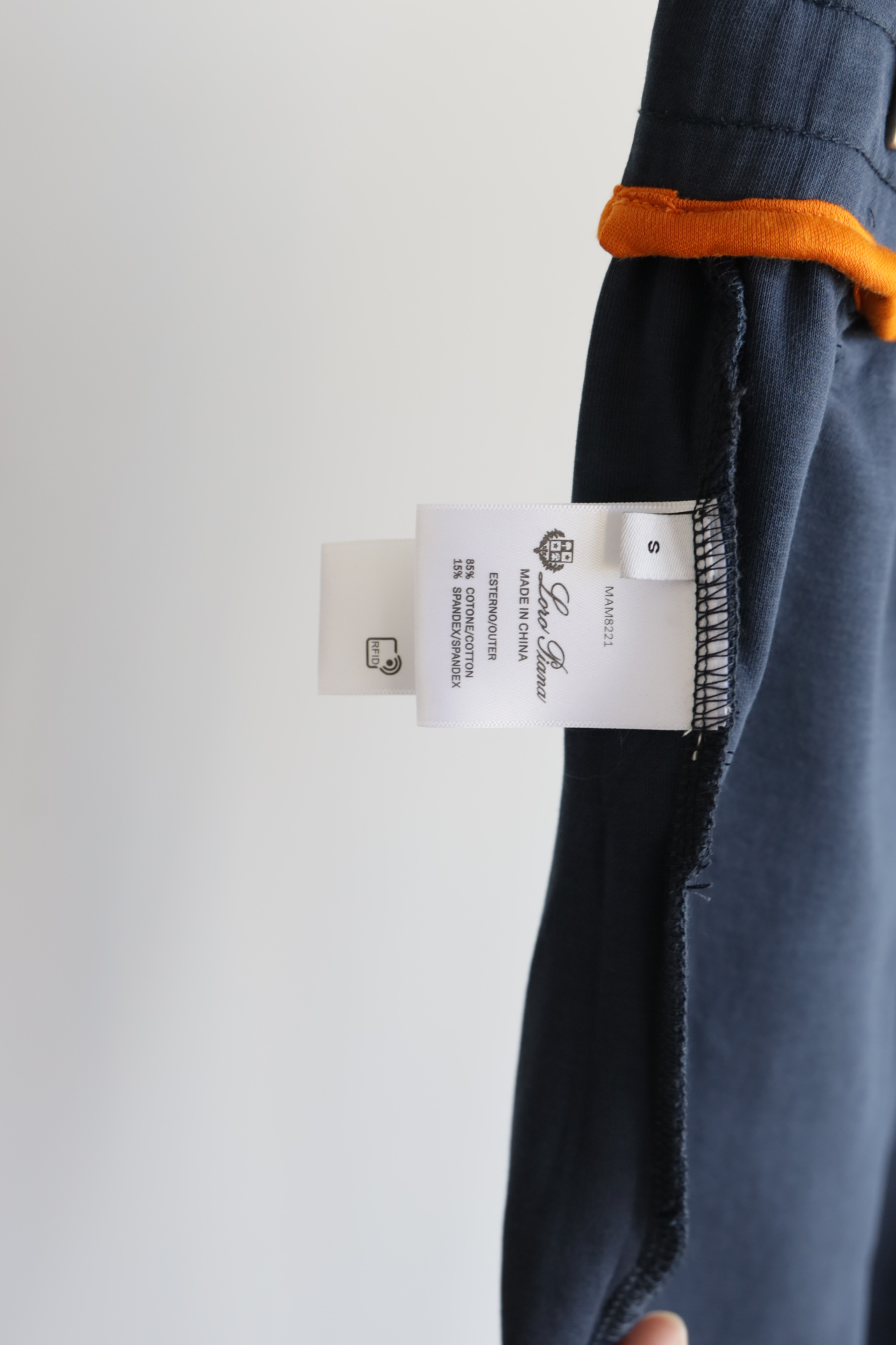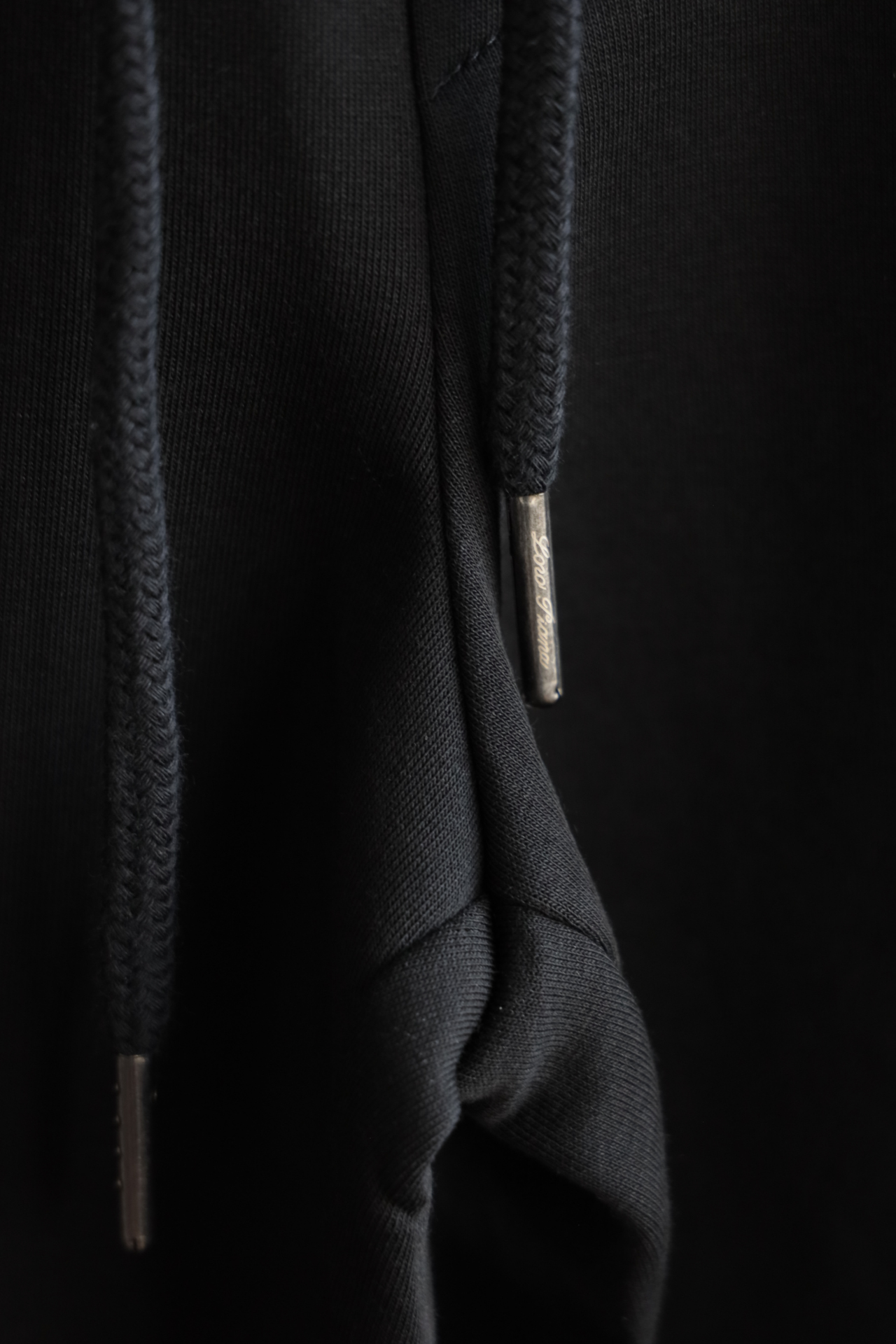 领口贴补三角+字母徽标,双标装饰,都是同色系黑色,风格整体简约低调有高级感