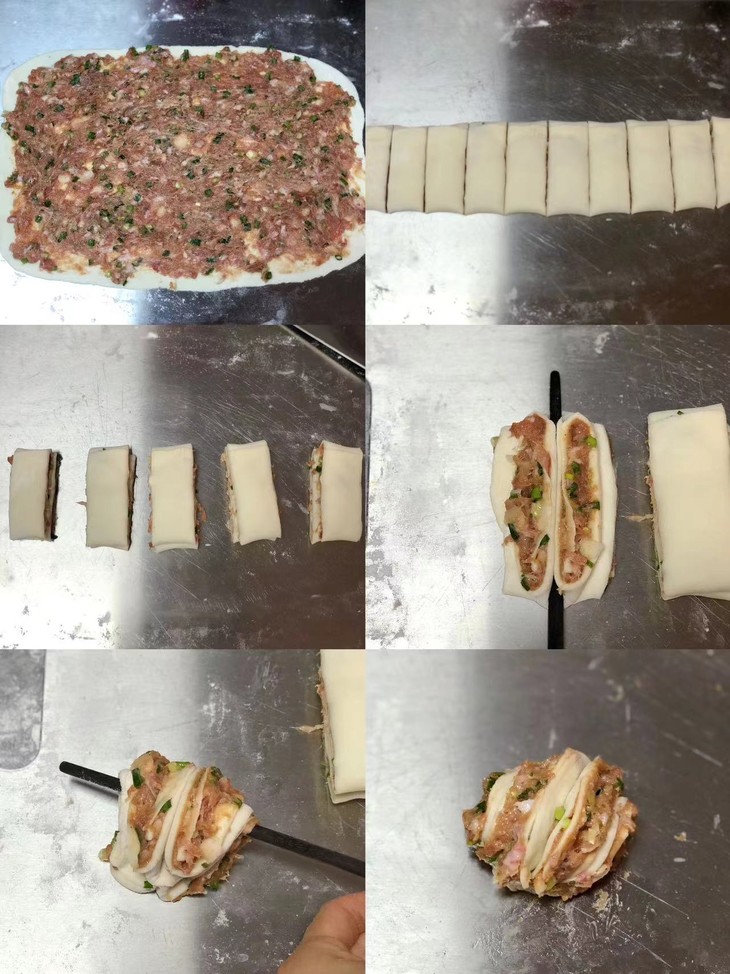 3、面团擀成长方形薄片,将肉馅儿均匀涂抹在表面,自上向下叠至三 分之一处,再从下向上叠起,整理成规整的长方形,切段,配方可做 肉花卷十个,所以要切20段。