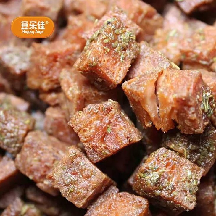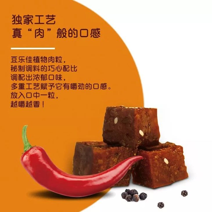 选用东北非转基因大豆蛋白为原料。 精选调料:重庆辣椒、四川麻椒、东北麦芽糖浆,让肉粒的每种口味都达到更佳。 采用植物香辛料提升香气和色泽,不含任何防腐剂、人工色素、化学香精和五辛。