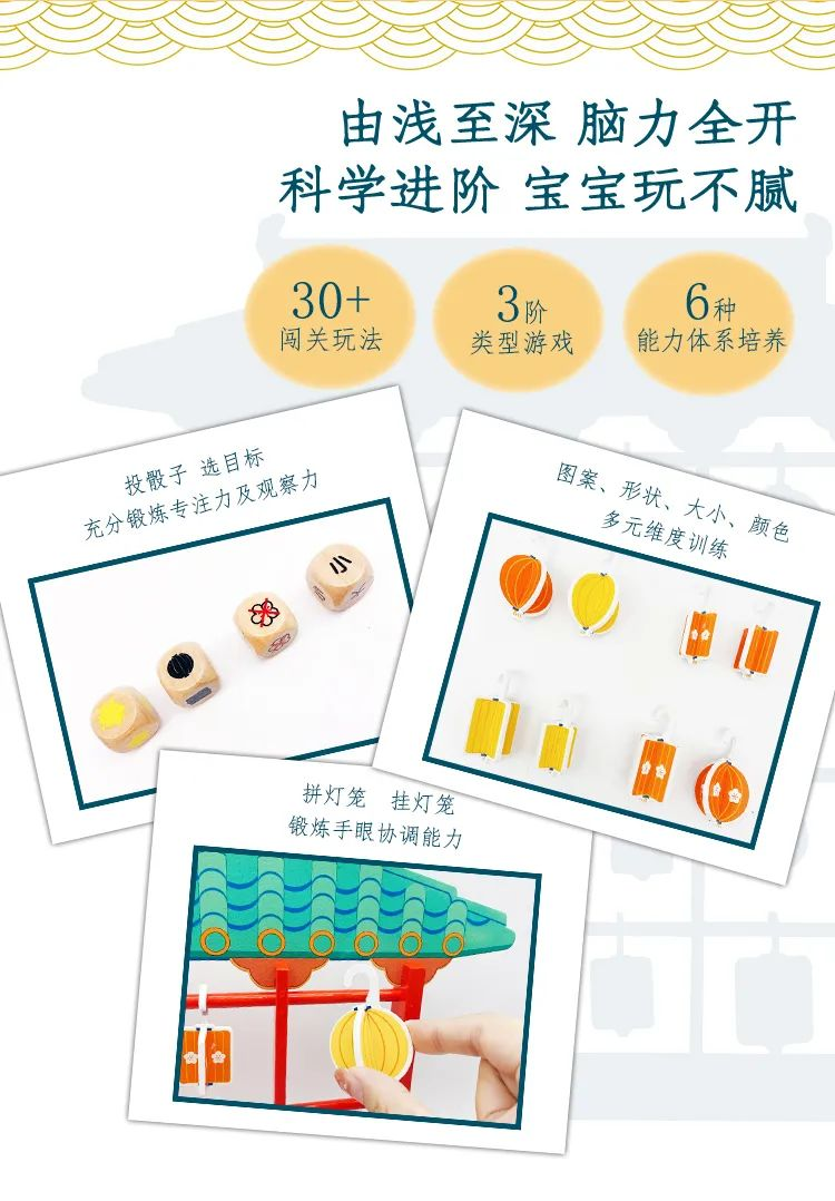 以花灯为核心设计元素,发散百变玩法!将赏花灯-识花灯-挂花灯-玩花灯有机融入玩法,科学进阶、循序渐进锻炼宝宝观察力、专注力、文化力、手眼协调能力、灵活策略能力、逻辑推理能力等黄金6力!每一步小挑战,让能力步步提升,增强宝宝的自信和克服困难的勇气!