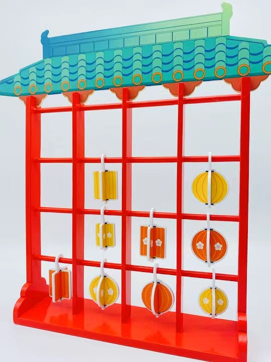 拿出灯架及卡片,游戏者看着卡片在灯架的对应位置上挂灯笼,锻炼宝宝的观察能力、视觉转换能力及手眼协调能力。