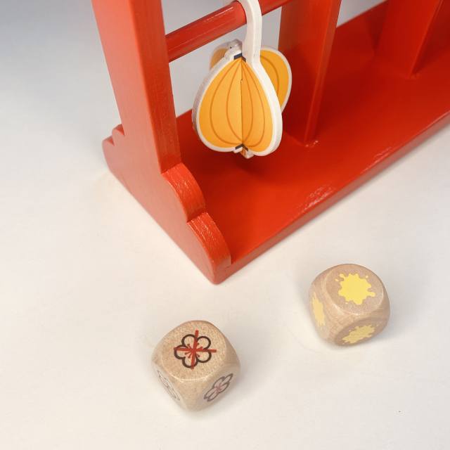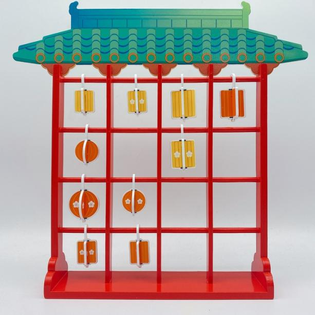 此游戏采用共用棋子这个机制,这也是我认为这个玩具突破的亮点。不同与市面上大部分桌游的提前分好棋子的方式,中华花灯会将所有灯笼设定为共用棋子。两名游戏者轮流挂灯笼,若横向、竖向或斜线上有4个具有相同特征的灯笼,则该游戏者获胜。游戏双方在过程中在以自己的角度寻找突破口的同时还需要全盘观察,考虑对方可能组合成线的维度,的确非常锻炼宝宝的观察力及策略能力。