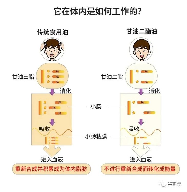 甘油三酯食用油易于在体内堆积脂肪,相反的是甘油二酯食用油不会在体内堆积脂肪,直接代谢为身体提供能量,在消化过程中如一束小把火,加速代谢,燃烧脂肪,非常适合肥胖和慢性疾病的人群食用。
