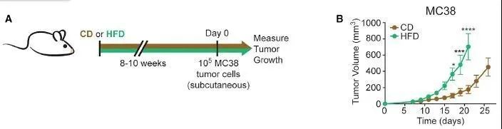 ▲▲▲移植MC38的结肠癌小鼠模型中,高脂肪饮食组的肿瘤长得更快