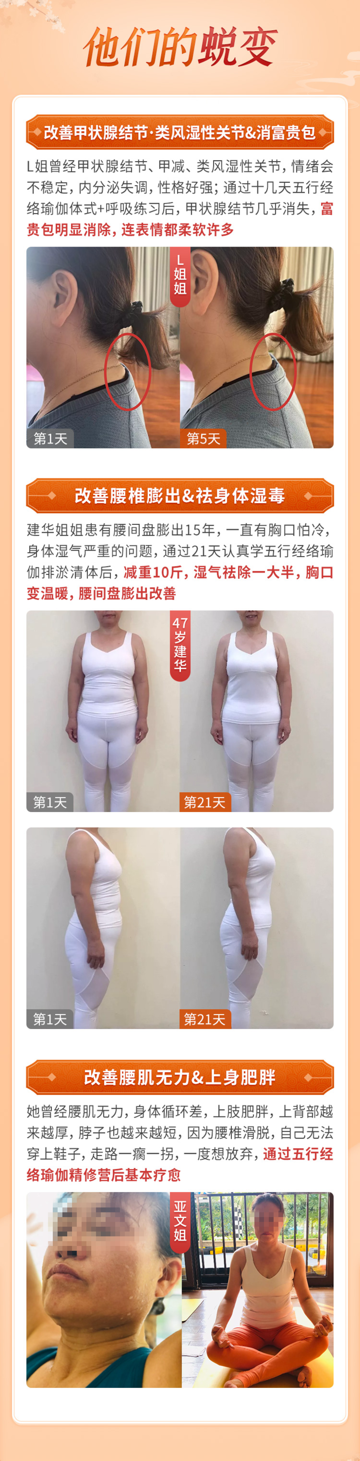 亚文腰椎滑脱,站着难坐,坐着难站。多亏了经络瑜伽,疏通淤堵,打通关节。现在不止腰不痛了,就连体重也掉了很多,肉肉明显收紧,衣服都得换一个更小的码数。她还推荐老公一起来练习,老公的膝盖滑膜炎有六年时间,走路都难受。好在经络瑜伽动作简单舒缓,男性练习也没有压力。