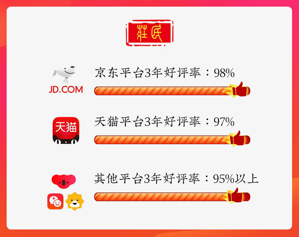 庄民养生品牌,成立至今有三十二个年头,分别在天猫、京东、考拉海购、盒马鲜生线上线下均有产品销售。作为健康的守护者,消费者就是庄民品牌的“衣食父母”,庄民全体员工一直尽心经营各个平台店铺,并设有专业的售后团队人员来处理消费者的纠纷问题。从近3年的数据可以显示,京东店铺的好评率为98%,天猫好评率为97%,其他平台也从未低于95%。