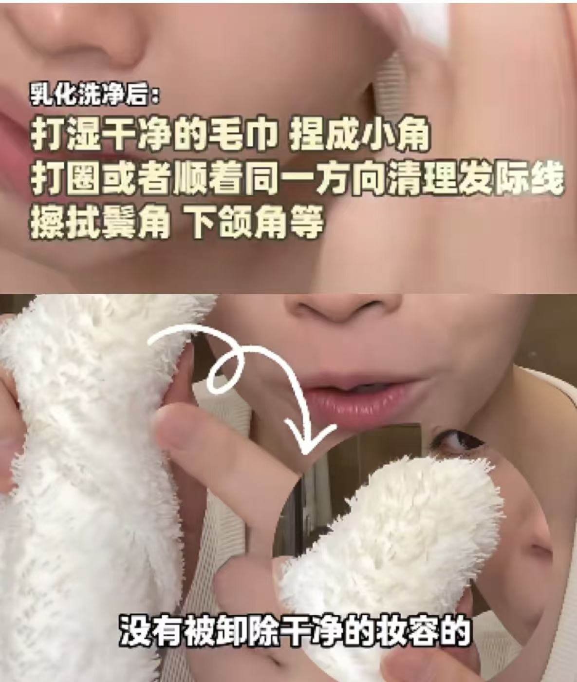 用清水把脸冲干净后,把洗脸巾或毛巾打湿、拧干,折个小角,顺着发际线、鬓角、下巴边缘这些容易残留的地方,轻轻擦一圈或打圈清理一下。这些“死角”清洁干净了,才不会长痘痘闭口。