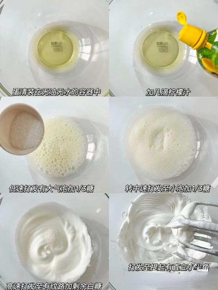 3、蛋白加几滴柠檬汁,低速打发有大泡时加第一次糖,转中速打发有密集小泡加第二次糖,转高速打发至有纹路时加剩余的糖;