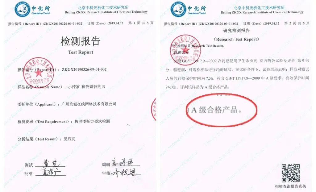 把产品送去权威的检测机构,同样经得起考验,检测结果是:A级合格产品。不要小看这个A级产品,这已经是驱蚊效果分级里的最高级。