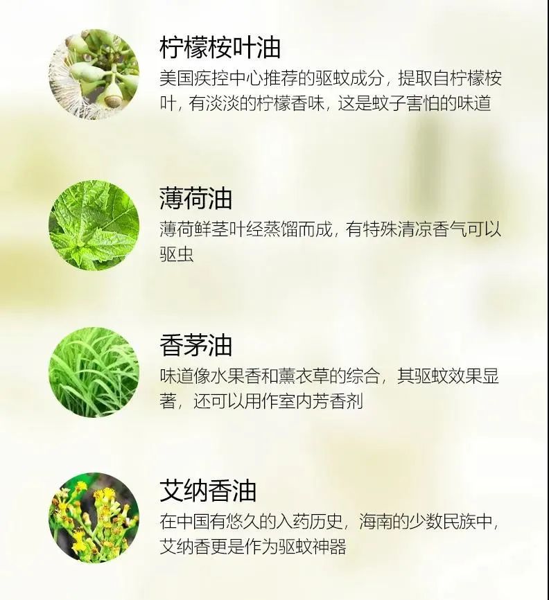 摒弃了化学成分配方,【不含避蚊胺,不含除虫菊酯】采用的是更加珍贵的植物驱蚊成分——柠檬桉叶油+香茅油+艾纳香油+薄荷油。