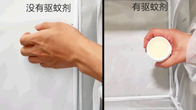 实验人员最后还做人体测试,直接把自己的手放进蚊笼,对比效果也是非常的明显:没有驱蚊剂时,蚊子主动攻击手部,有驱蚊剂时,蚊子根本找不到攻击目标。