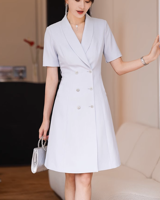 连衣裙夏季上班穿搭的心头好 简单又百搭透露出了职场女性的优雅 舒适透气 给你放心的穿着体验西装领设计正式感满满 不失气场成衣流畅的线条