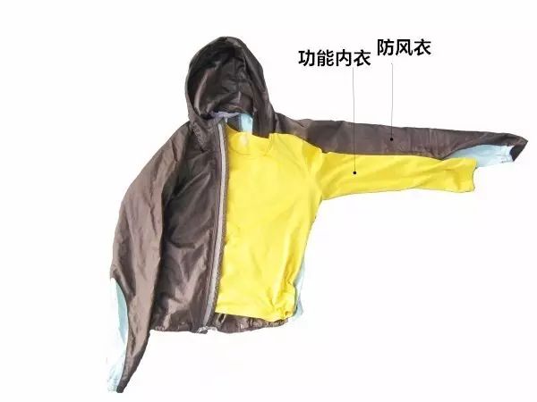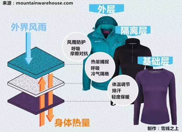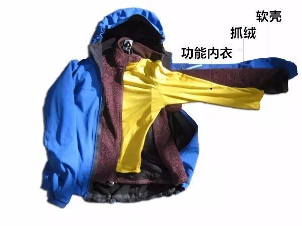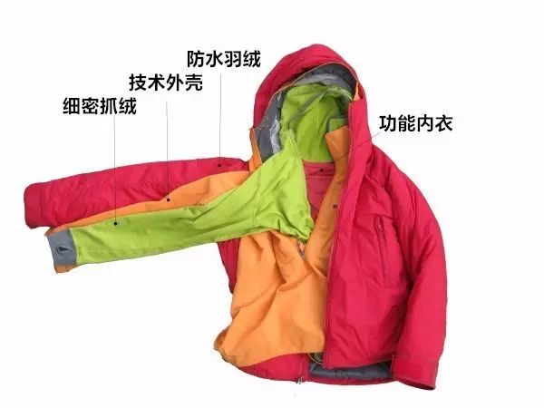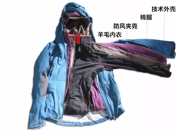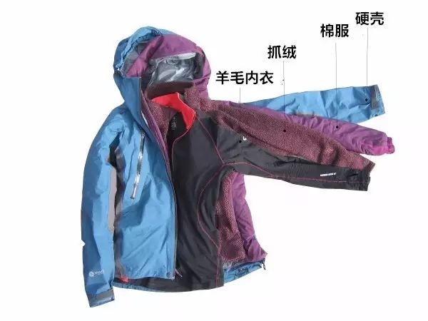 羊毛内衣用于基础层,防风夹克和棉服共同运用于隔离层,技术外壳作为外层使用。具体作用如下: