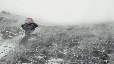 山脊行进时遭遇大风,此时衣物的防风性能便受到考验,空气的对流会迅速带走温暖,“风寒效应”足以致命。动图来源:horhay hopkins上传的《ridge climb in wind and rain》
