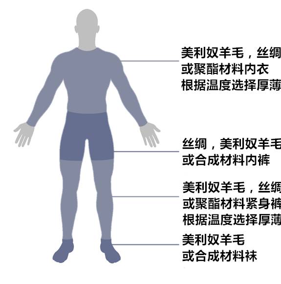 基础层选择——基础层的选择立足材料透气性和合身程度,厚薄保暖程度根据天气状况选择。