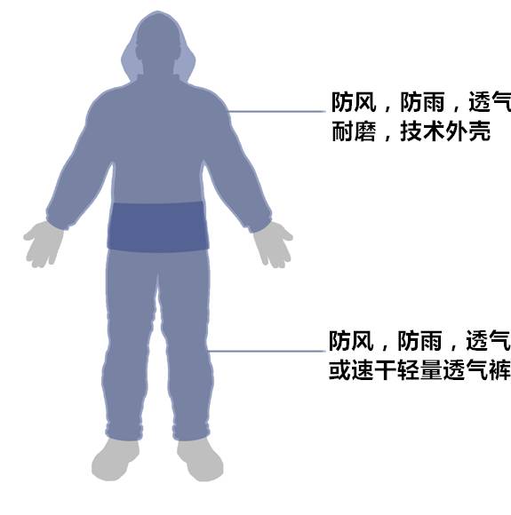 外层选择——外层是坏天气的好伙伴。如果水浸入身体或汗水不能有效排出,聚集内里都会让人体寒冷。