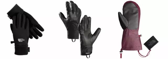 轻薄型手套提供基础的保暖防护,比如左图的北面(TNF)弹性抓绒手套;基础功能型手套防风保暖,比如中图的始祖鸟(Arcteryx)领悟软壳手套;