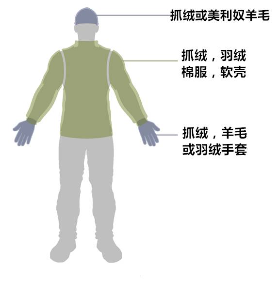 极端气候下活动的着衣选择类似于冬季多层穿法,但应该更厚,提供更多保护。