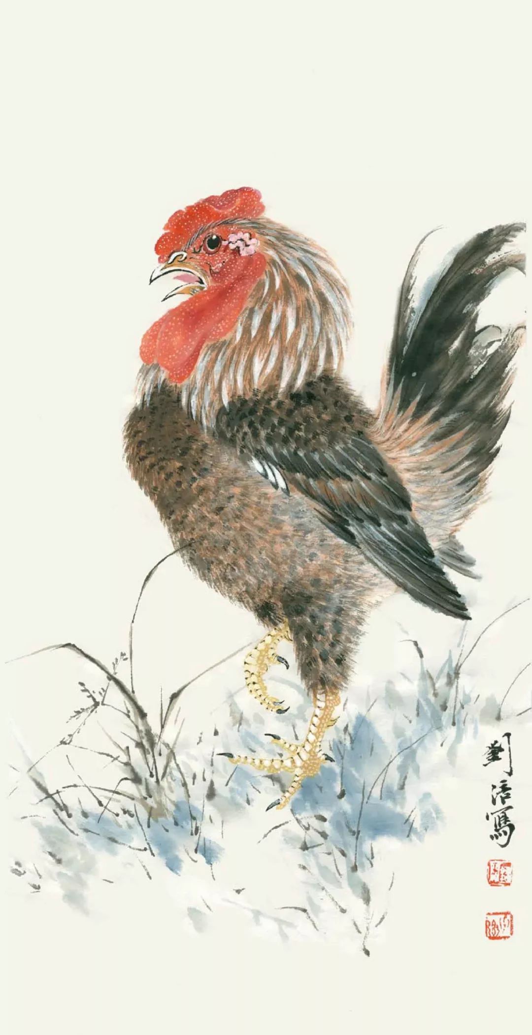 9.在鸡的周围加画些许杂草,表现其悠闲、野逸之趣;草的虚、鸡的实是相互映照的主辅关系。在适当位置落款、钤印。