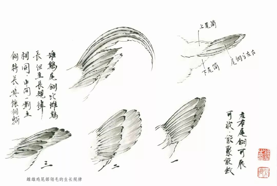 5.画出公鸡的尾翎,注意长短变化,按其生长规律组织,用藤黄调赭石写出公鸡的爪部,重墨点趾甲。