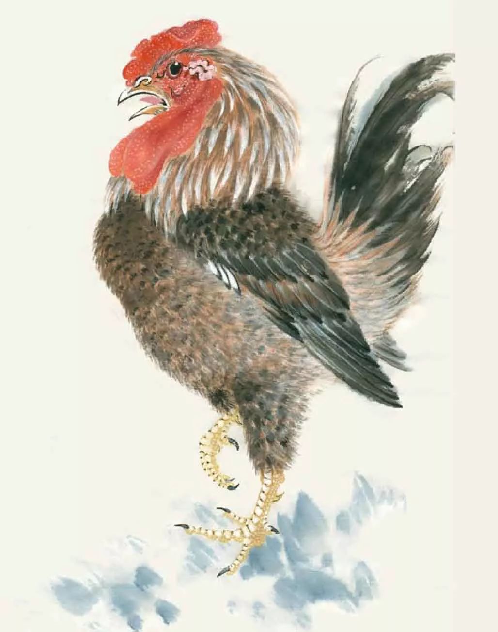 6.公鸡通身敷染淡赭石,使其温润;覆羽、飞羽以及尾翎敷染淡花青,以表现其劲挺的质感和神采;用藤黄染鸡嘴,胭脂分染眼白。