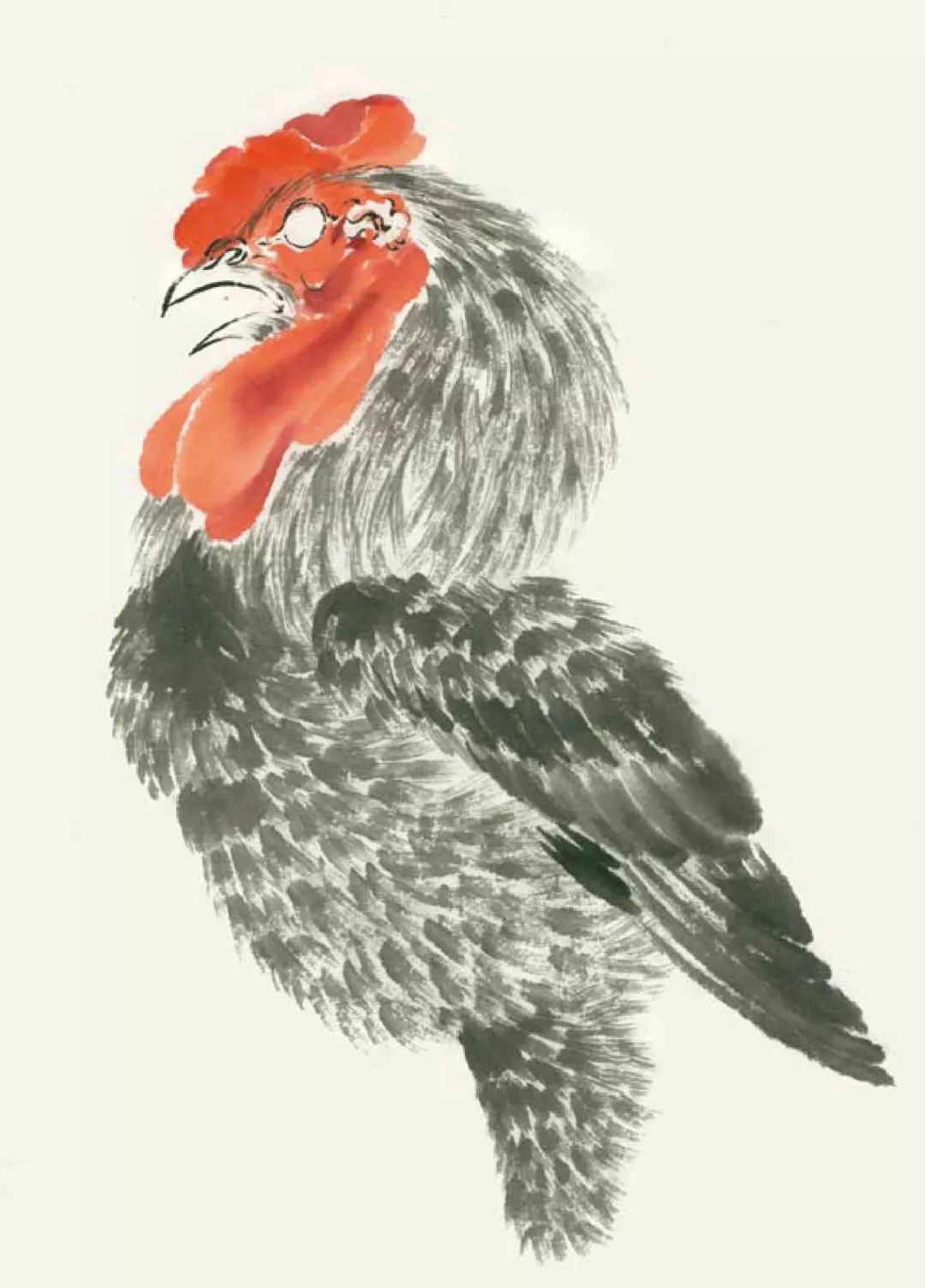 4.用渴笔中墨丝画出公鸡的头、颈部分,注意表现其蓬松有力的质感;用重墨点画出公鸡的肩背及覆羽、飞羽,干笔点画出胸腹和大腿。
