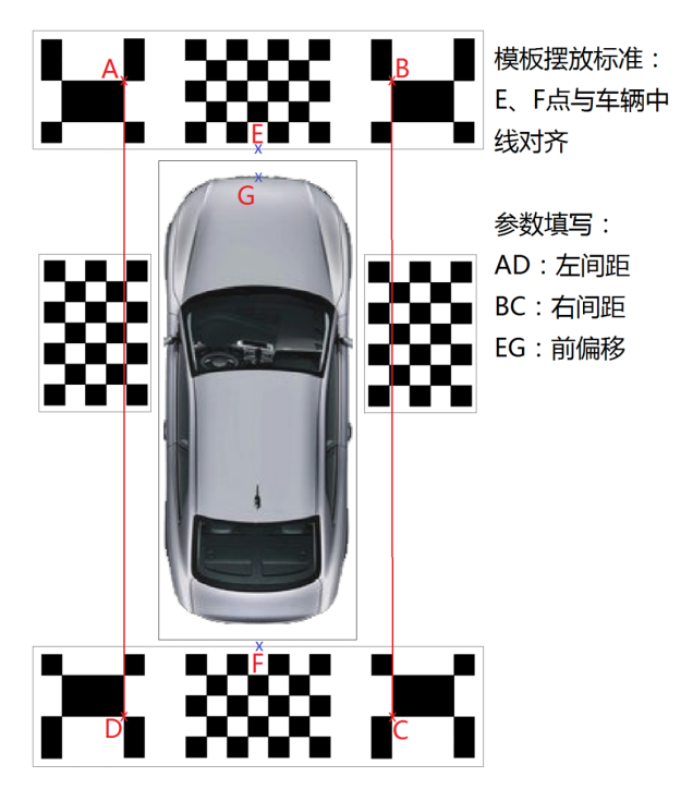 4. 用卷尺对准标定布上指定位置,测量并记录如下三个数据:AD=左间距,BC=右间距,EG=前偏移