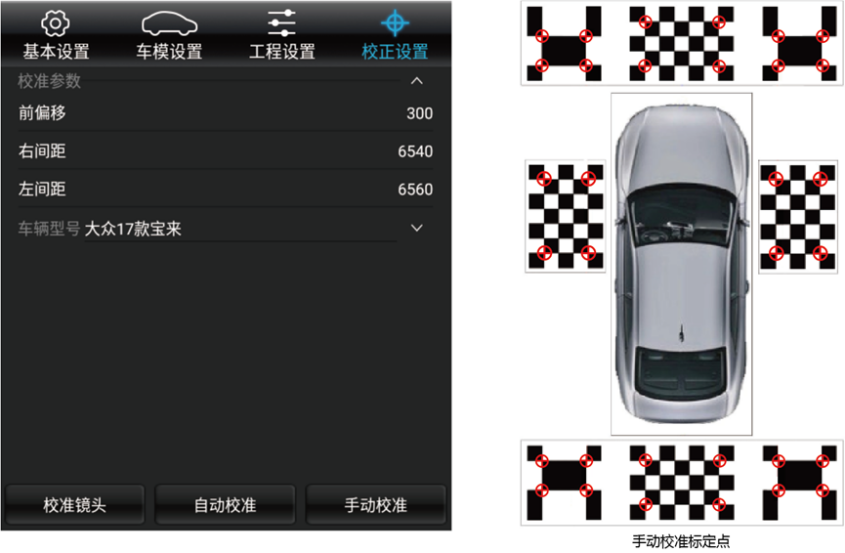 2. 按照模式1提示摆好调试布,前后调试布中心点与车身正中对齐,左右调试布黑点和左右摄像头对齐,固定好不让风吹歪。前后调试布边缘距离车头车尾约30 cm;左右调试布边缘距离车身约10--30cm。