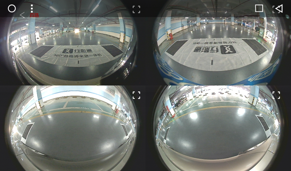 5. 四个摄像头安装完成后,安装人员可通过四分屏图像对摄像头位置和角度进行调整,以便达到最佳的角度效果.为拼接质量达到最优,请确保在摄像头矫正的四个摄像头单成像时,图像处于屏幕的正中心,四周暗角分布均匀。