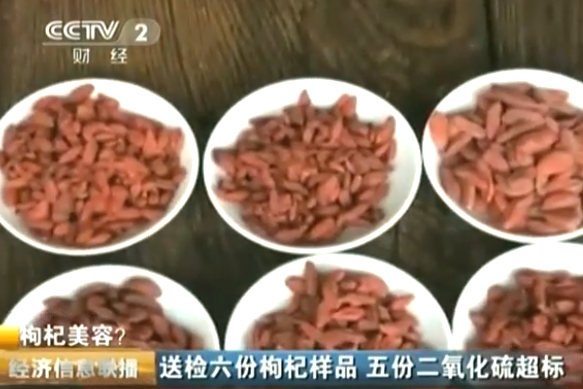 ● 其中一份在商场内土特产摊位上购买的,标价为150元/斤的“枸杞王”,其二氧化硫含量为971mg/kg,超过国家标准规定近20倍!