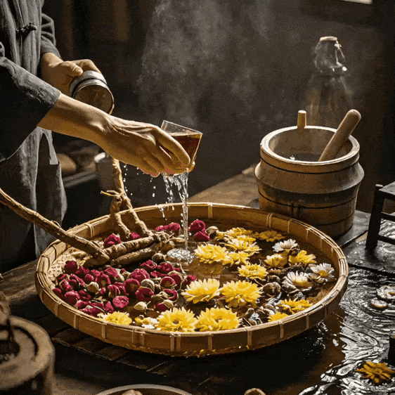 子时用吴山古井水,浸泡黄精、当归等根茎类;午时以日晒山泉润玫瑰、菊花花果类;酉时人工翻搅,使其吸水均匀。