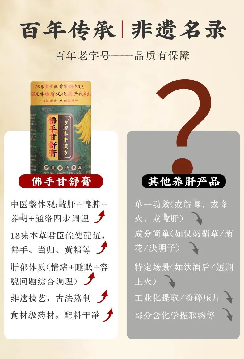 相比其他普通产品,佛手甘舒膏在一定程度上综合调养身体,比肝片更温和,比肝茶更有效。