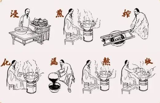 于紫铜锅内,18小时左右完成文武煎煮,武火提气,沸腾煎煮提取佛手柠檬烯等挥发油;文火取味,慢熬萃取出苷类、多糖。
