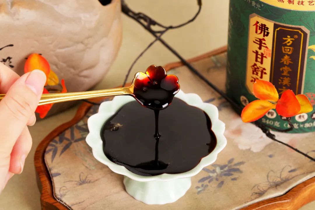 佛手甘舒膏采用方回春堂传统膏方制作技艺,结合现代工艺匠心熬制,从开方到收膏,历经浸泡、煎煮、沉淀、浓缩、化膏、过滤、收膏、分装8道工序
