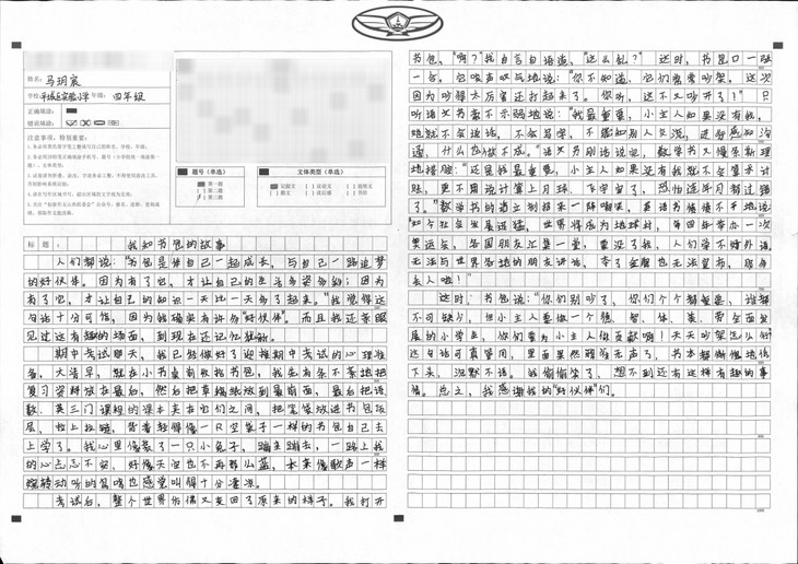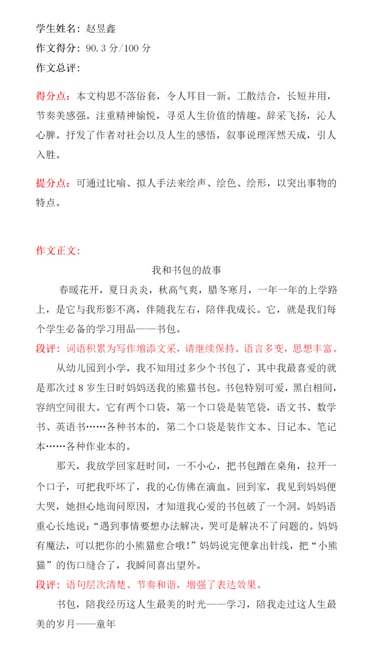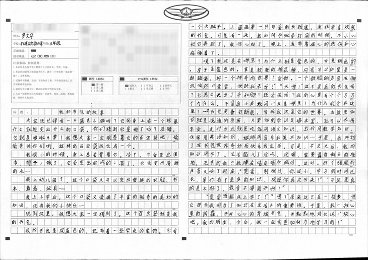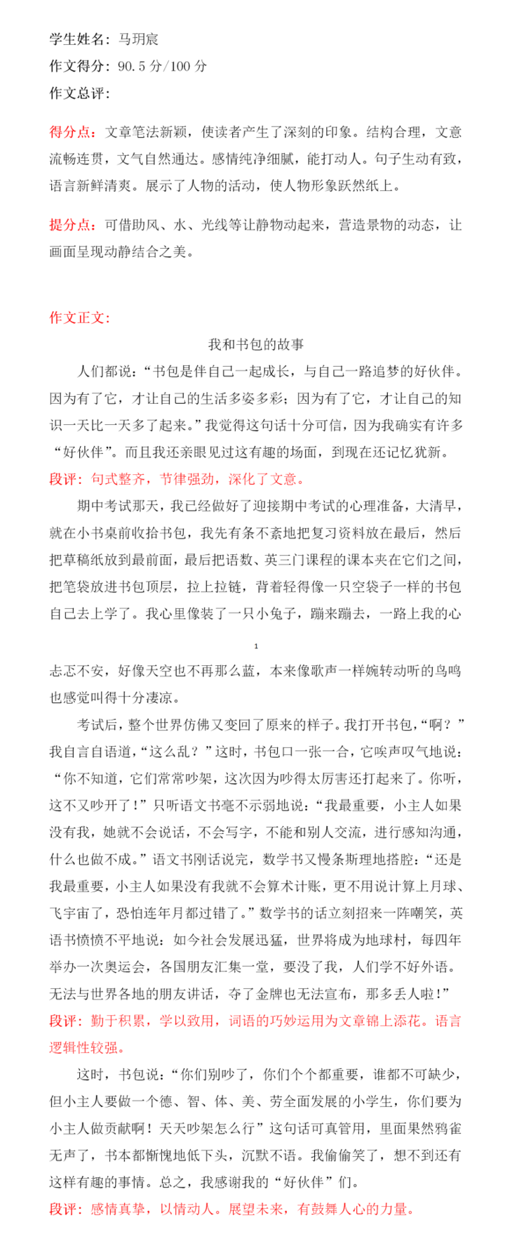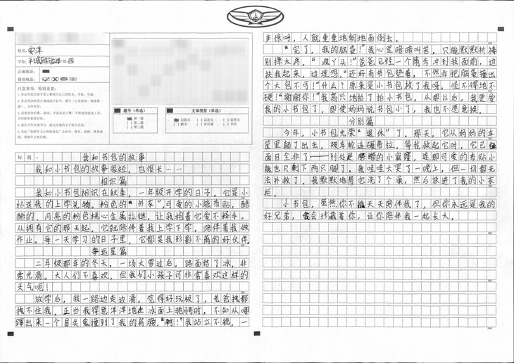 本篇文章内容由考试引起,到各课本争功,再到书包对它们的谆谆教诲。段落衔接自然、语句运用生动、字迹也很工整,是篇不错的文章。本文特点在于想象丰富,内容新颖。想象力丰富是孩子纯真的表现,身为教师可以守护这份纯真真是幸福不已,希望孩子可以在之后的写作上更加精进。
