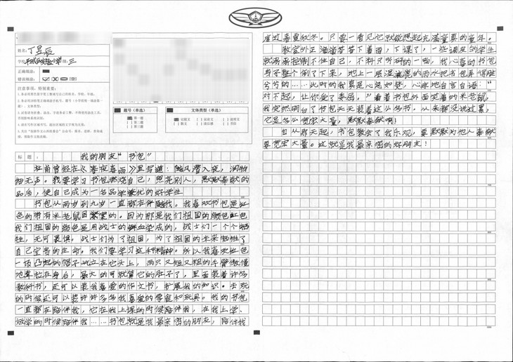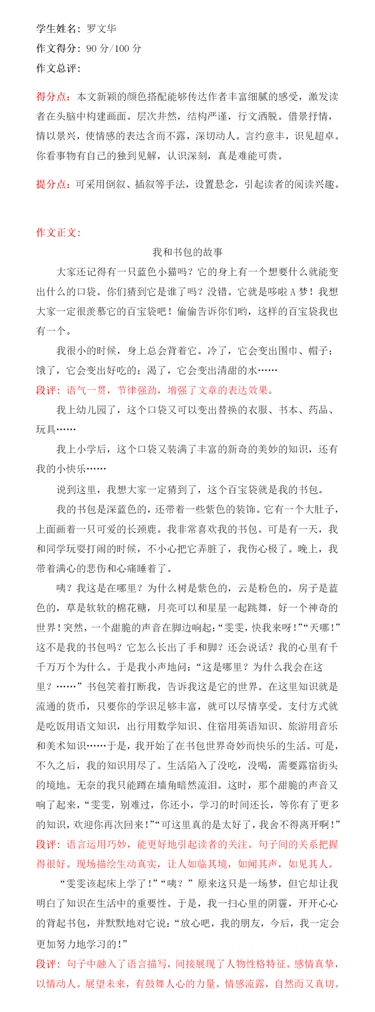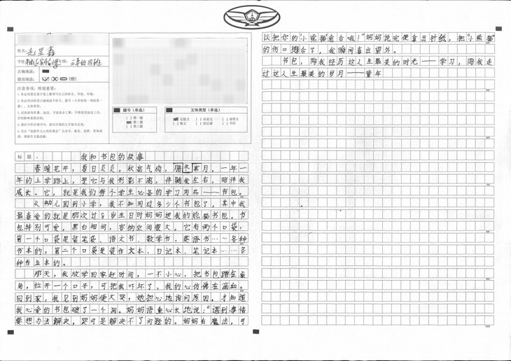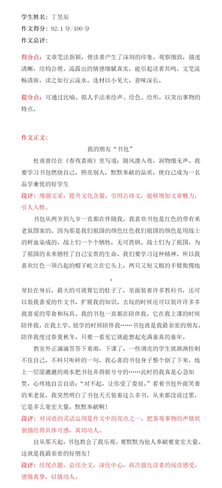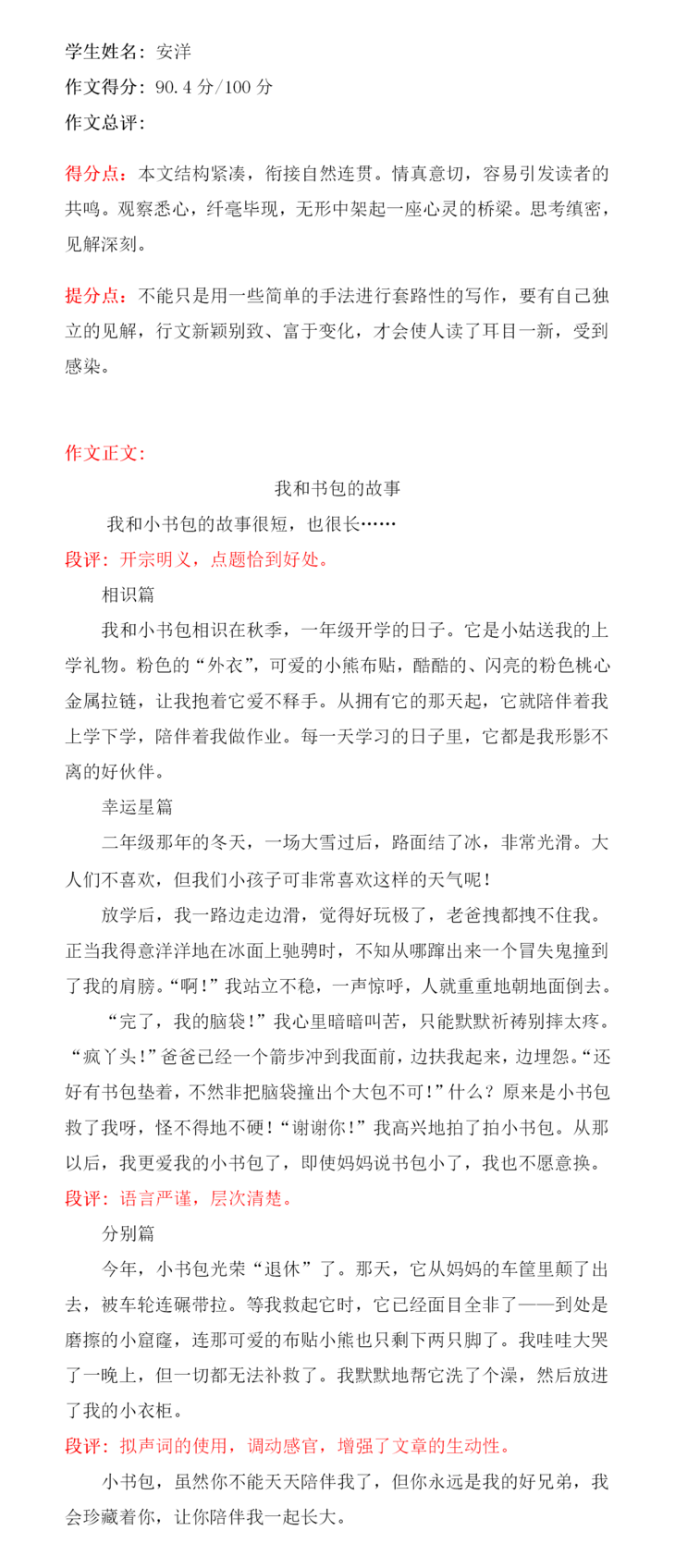 本篇文章内容由考试引起,到各课本争功,再到书包对它们的谆谆教诲。段落衔接自然、语句运用生动、字迹也很工整,是篇不错的文章。本文特点在于想象丰富,内容新颖。想象力丰富是孩子纯真的表现,身为教师可以守护这份纯真真是幸福不已,希望孩子可以在之后的写作上更加精进。