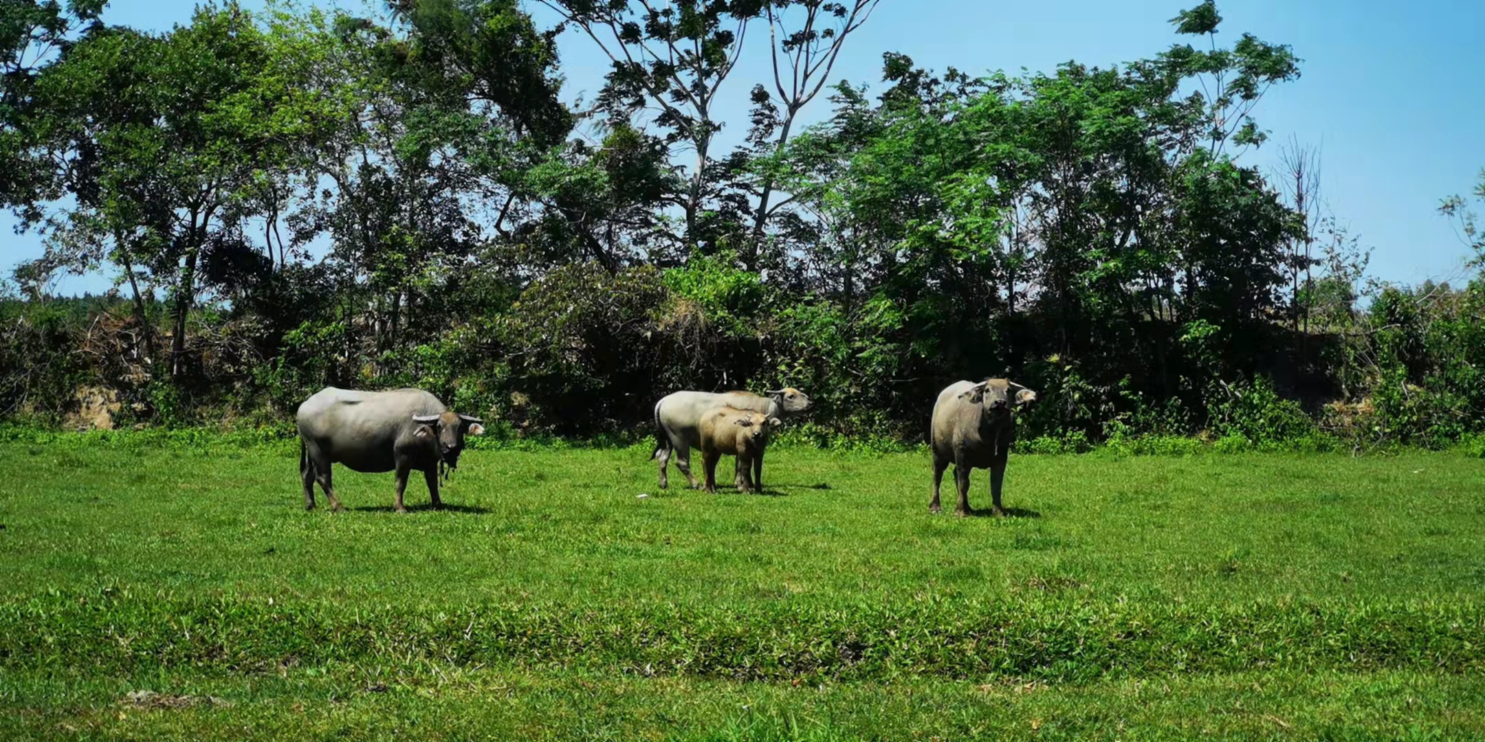 这是海南文昌县的水牛,在一篇空旷的水田里,悠闲的吃草,也没有人看管,他们是成群的散养,警惕性很高,小虫只能远远的给他们拍照。