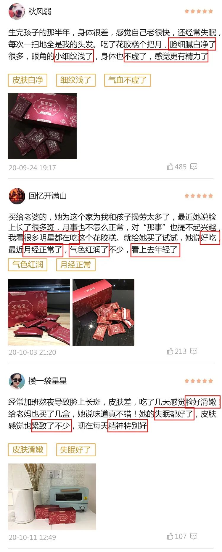 @一尾小鱼:以为就是个零食,没想到真的有效果!生完宝宝后大姨妈总是有点延迟,而且量还特别少,一天一片姨妈巾,2天就没了。吃了这个花胶糕,现在量正常了,气色也好了,皮肤白净通透,非常光滑。