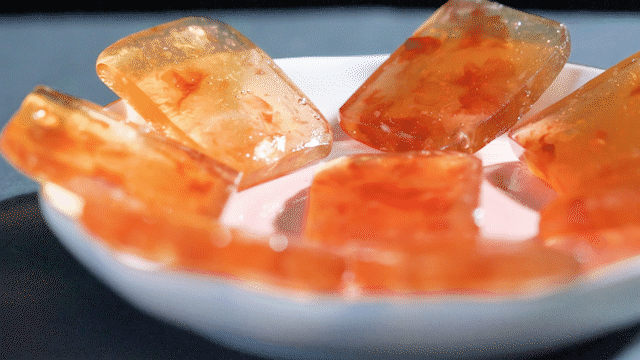 别小看一块小小的花胶糕,需要经过精选、浸泡、熬胶、加料、低压成型等好几道复杂工序,才能精制成糕!