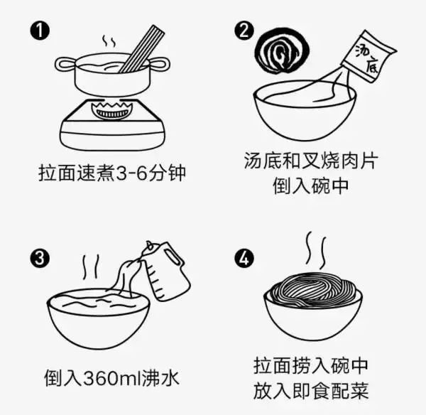 只要用沸水煮3-5分钟,劲道的面条就腾空出世啦,再另煮一锅开水,冲泡汤底、肉片和其他配料,一碗热气腾腾,色香味俱全的拉面就诞生啦!无需等待就可以享受一碗营养均衡,健康优质的拉面,接下来细细品鉴,享受一人食的快乐时光。