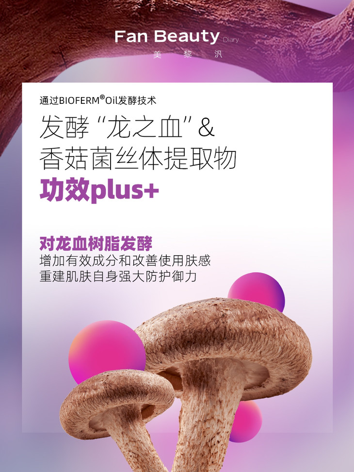 “龙之血”(麒麟竭提取物)&香菇菌丝体提取物,通过BIOFERM ® Oil发酵技术增加这两种植物有效活性成分和改善使用肤感,重建肌肤自身强大防护御力。