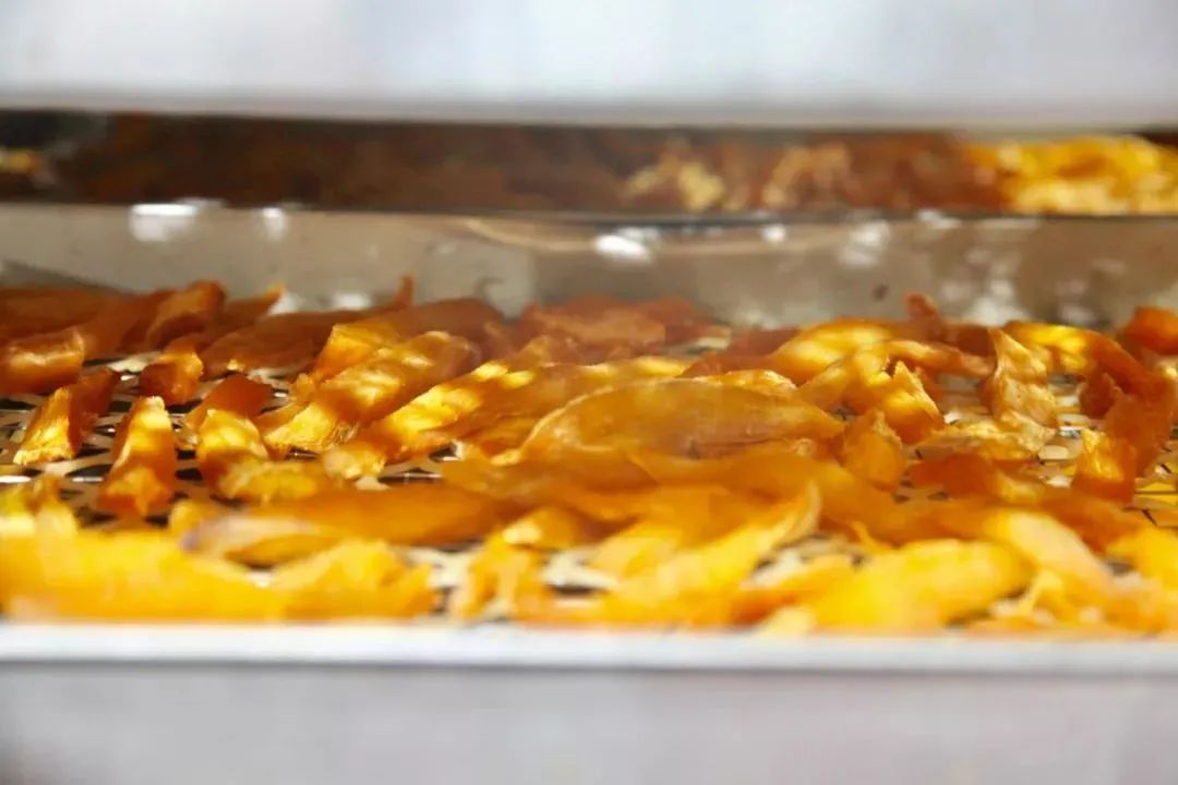 在加工过程中,为了保证薯干的干净卫生,也为了给红薯提供糖化环境,模拟传统农户种植的倒蒸环境,采用室内高温蒸汽烘箱烘干,使红薯中的淀粉充分的转化成糖份。